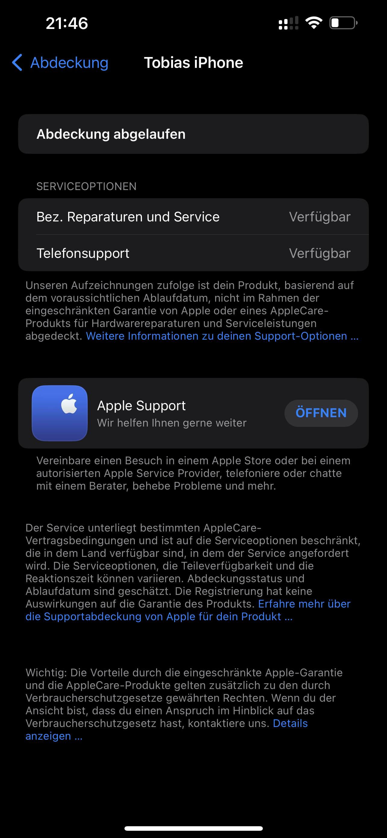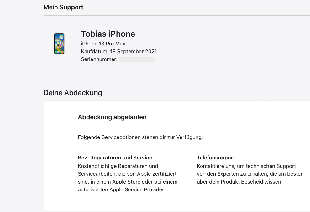 In den iPhone Einstellungen lässt sich nur Rückschluss auf die aktuelle Abdeckung des Gerätes erhalten, sprich ob diese abgelaufen ist und bis wann diese noch gültig ist. Ein Kaufdatum ist nicht zu finden. Hingegen kann auf der Check Coverage Seite ein Kaufdatum eingesehen werden.