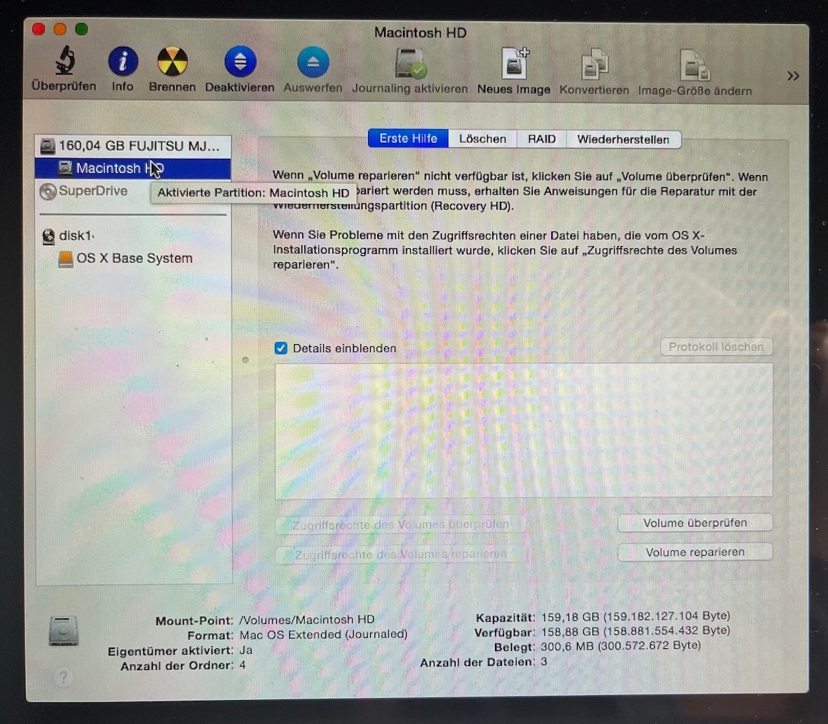 Dazu wählst du im Festplattendeisntprogramm den obersten Eintrag ("160 GB Fujitsu....") aus und klickst auf "Löschen". Danach einen Namen vergeben (z.B. MacIntosh HD), als Format MacOS Extended (HFS+) und Partitionstabelle GUID auswählen - bestätigen.