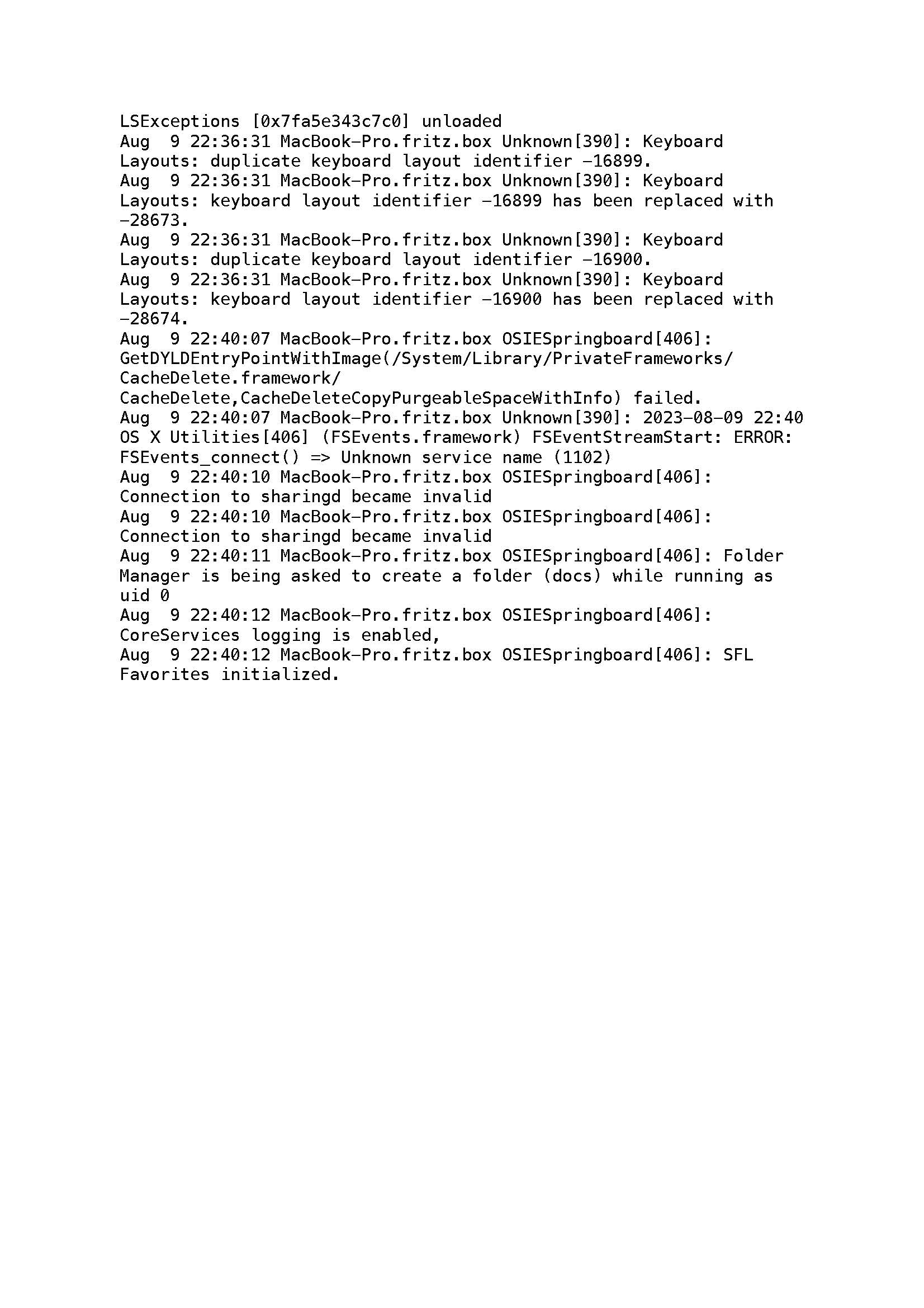 MacBook-Pro.local Unknown[390]: 2023-08-09 10:17 OS X Utilities[407] (FSEvents.framework) FSEventStreamStart: ERROR: FSEvents_connect() => Unknown service name (1102)