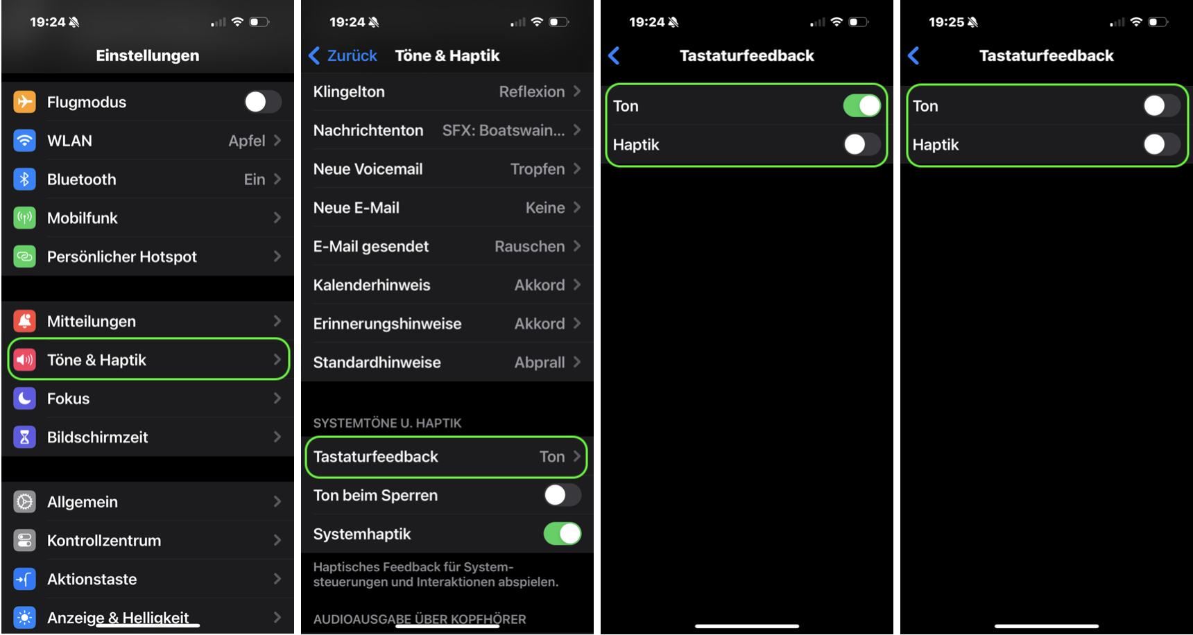 Habe die Einstellungen genau wie hier im rechten Bild beschrieben gemacht, Ton und Haptik aus, Telefon ist auch schon mehrmals neu gestartet, doch die Tastaturtöne beim schreiben sind an, es nervt!