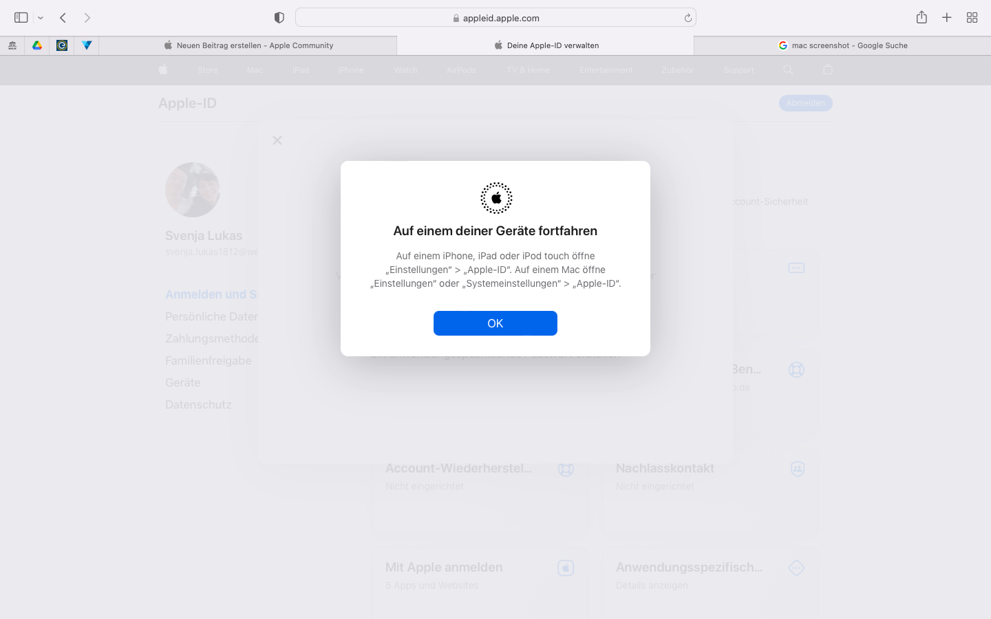 Ich möchte ein Anwendungsspezifisches Passwort erstellen und komme nicht weiter nach dem Punkt Password erstellen. Danach taucht das Fenster auf auf einem anderen Gerät fortfahren. Die Punkte die in dem Fenster angegeben sind habe ich befolgt und it OK bestätigt und ab da an passiert nix mehr.