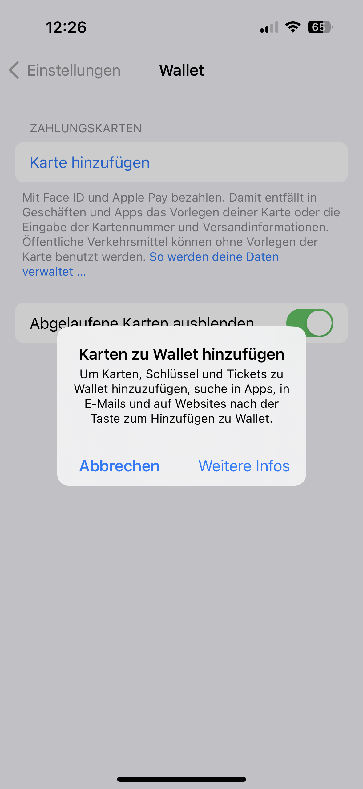 Ich möchte erstmals eine Kreditkarte hinterlegen. Ich erhalte immer folgende Fehlermeldung trotz aktueller Software, Face ID etc.