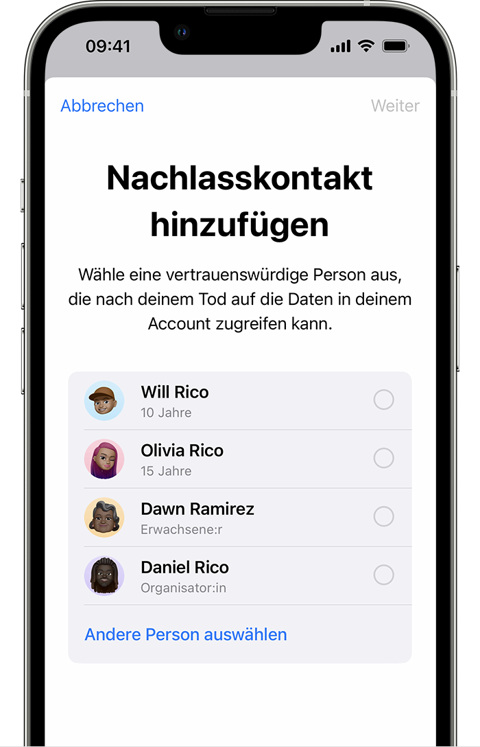 Du kannst eine beliebige Person als Nachlasskontakt auswählen und mehr als einen Nachlasskontakt festlegen. Die Person muss nicht einmal eine Apple-ID oder ein Apple-Gerät haben.