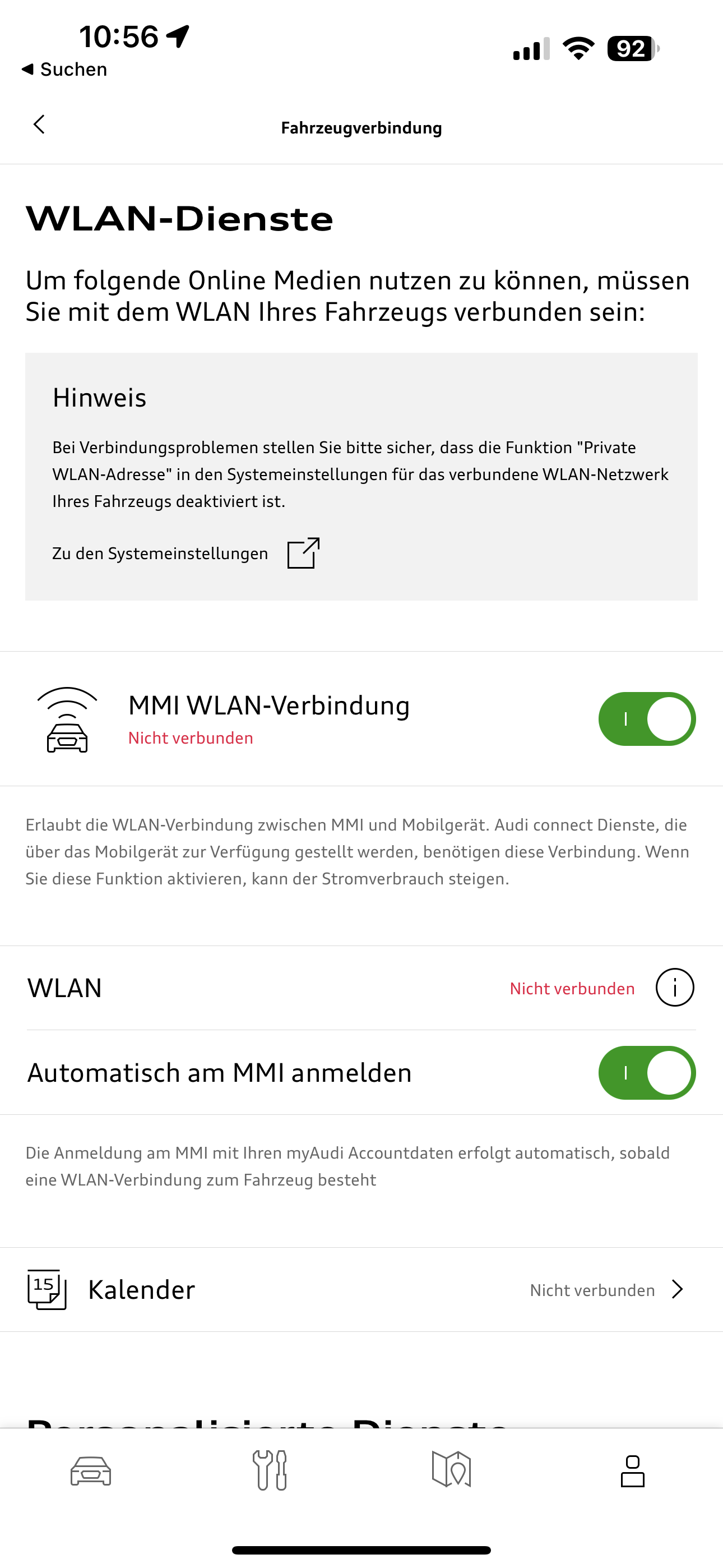 Ich habe auf das IPhone 14 Pro MAX gewechselt und kann in meinem Audi A6 keine WLAN Verbindung mehr aufbauen. In der myAudi APP wird angezeight nicht verbunden, obwohl das WLAN auf dem IPhone als Verbunden dargestellt wird. Somit kann ich die Umfänge meines AUDI Connect Systems nicht nutzen.