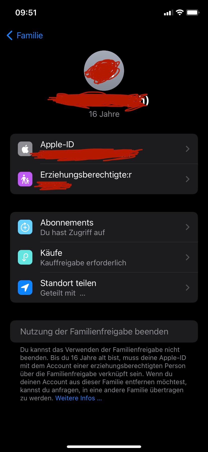 Ich bin heute 16 geworden und wollte die Nutzung der Familienfreigabe beenden aber ich kann nicht auf „Nutzung der Familienfreigabe beenden“ drücken.