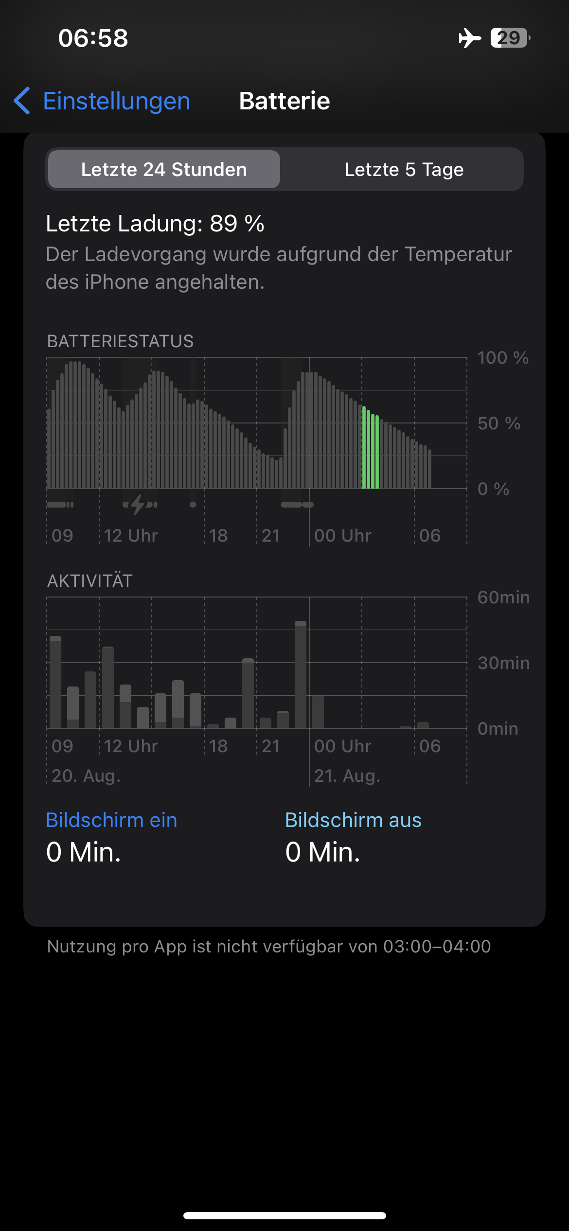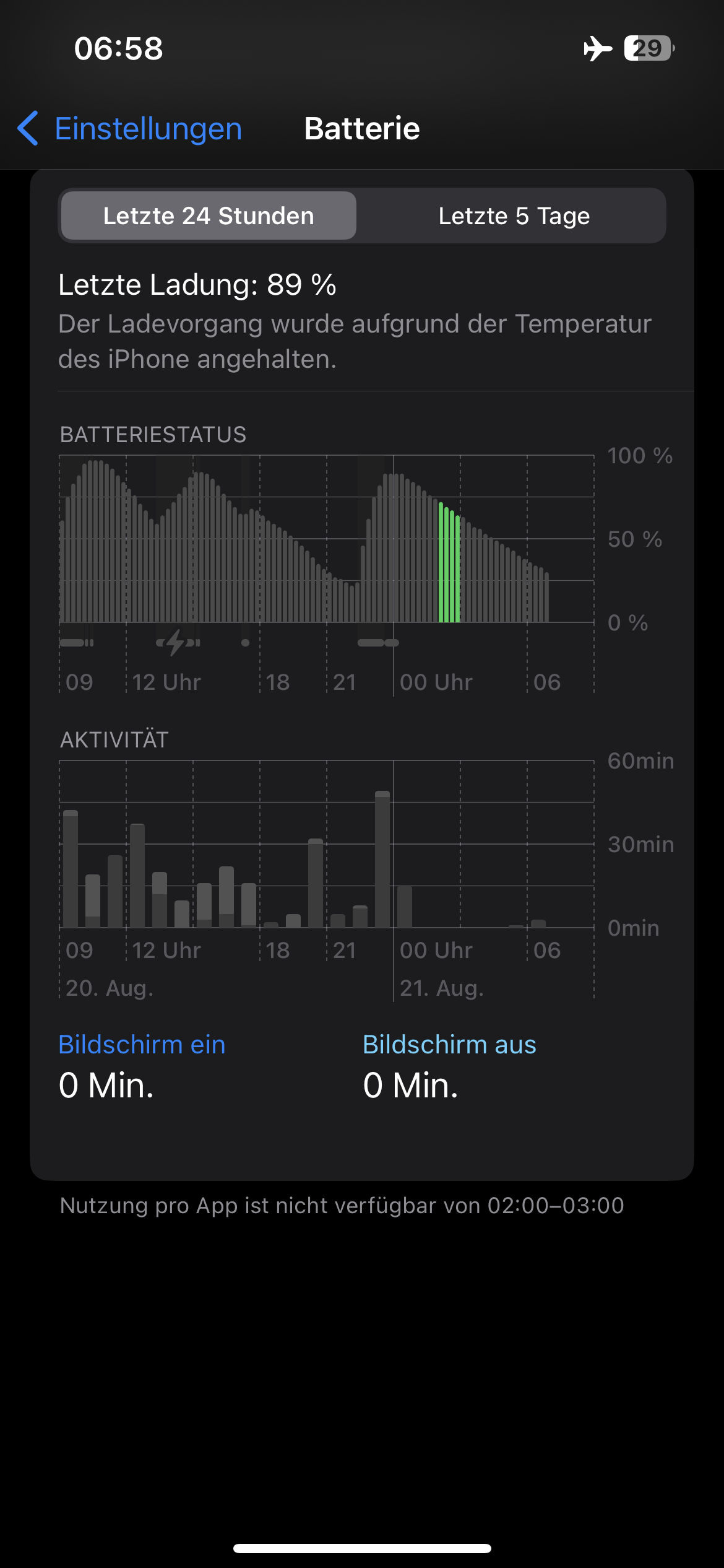 Abends mit 80 Prozent im Flugmodus abgelegt, morgens nach 9 Stunden nur noch 20 Prozent Ladung.