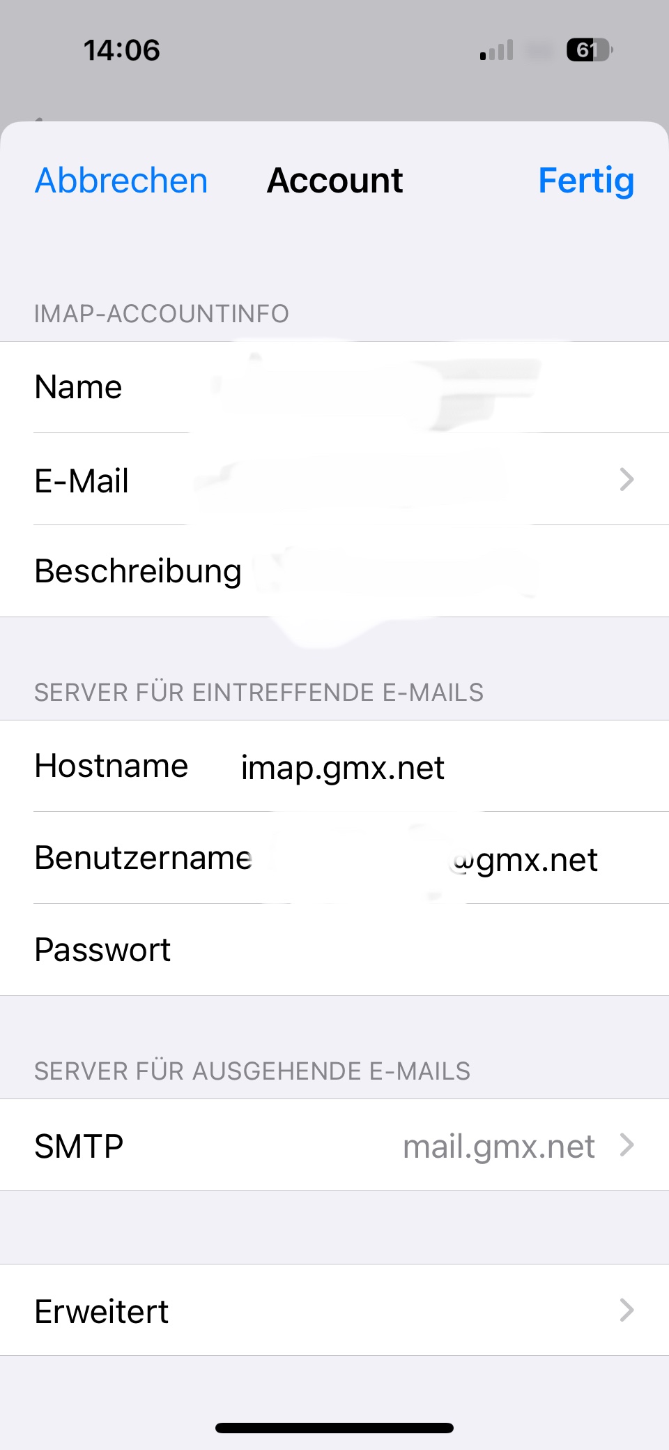alle vom iphone (14 Pro, ios 16.6) gesendeten Emails synchronisieren nicht mit GMX. Die emails sind im Sent-Folder auf dem Iphone, aber nicht im Sent-Folder in der Web-Applikation und dem Outlook, andersherum sind alle in der Web-Applikaton oder dem Outlook gesandten Emails "runter"-synchronisiert ins Iphone, das Problem besteht also bei keinem anderen Gerät, nur beim Iphone.