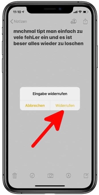 Nun kannst du, wenn du z.B. beim Tippen ein Wort zu viel gelöscht hast, dein iPhone ein bisschen hin und her schütteln bis sich folgendes Menü öffnet. Dort tippst du dann auf „Widerrufen“ und das gelöschte Wort erscheint wieder.