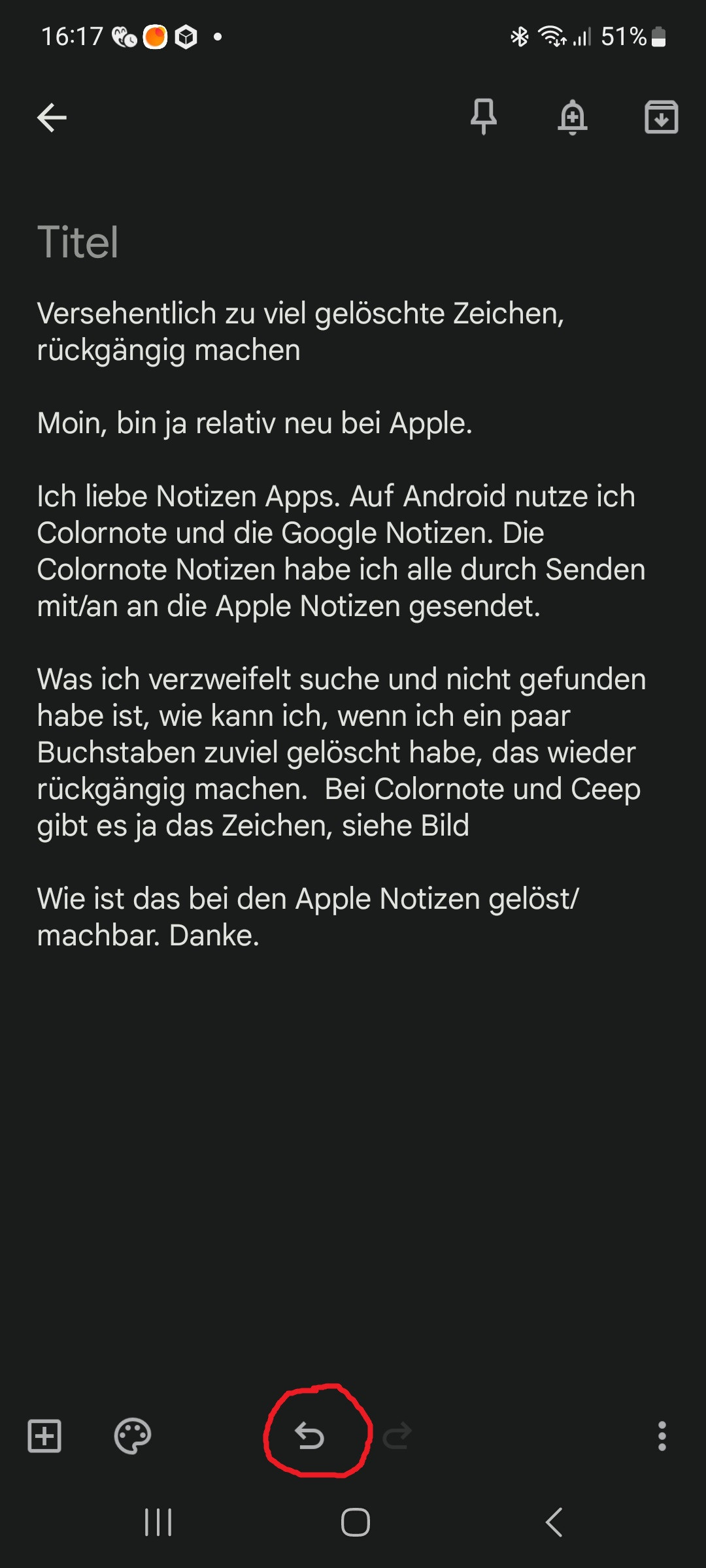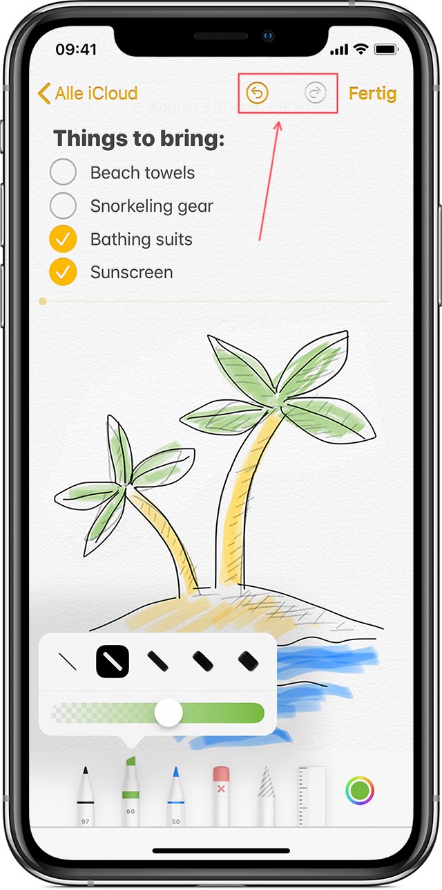so einen Rückgängig-Knopf steht dir in der „Notizen“-App auf dem iPhone nur zur Verfügung, wenn du etwas zeichnest. Um in den Zeichnen-Modus zu gelangen, tippst du auf das Stift-Symbol.