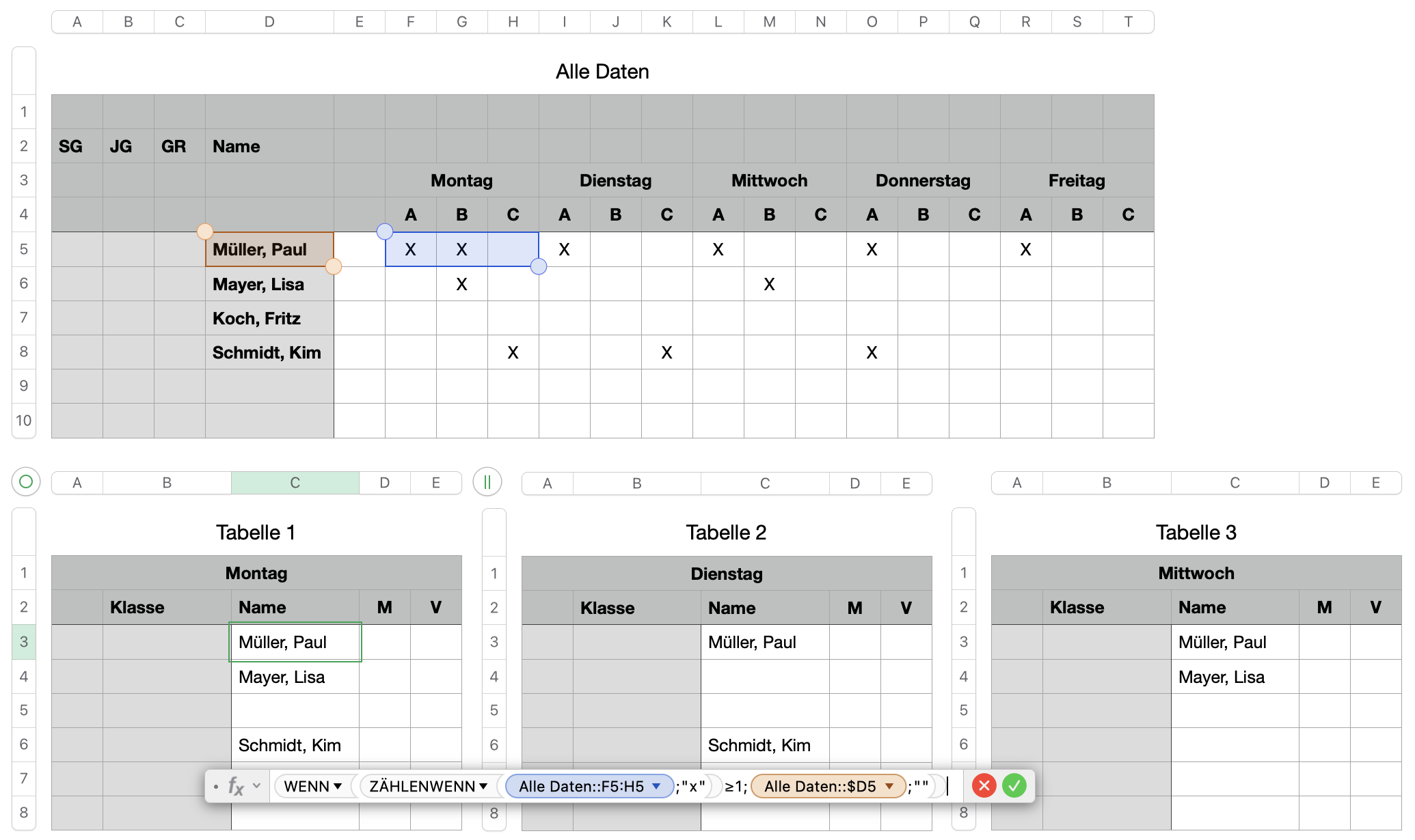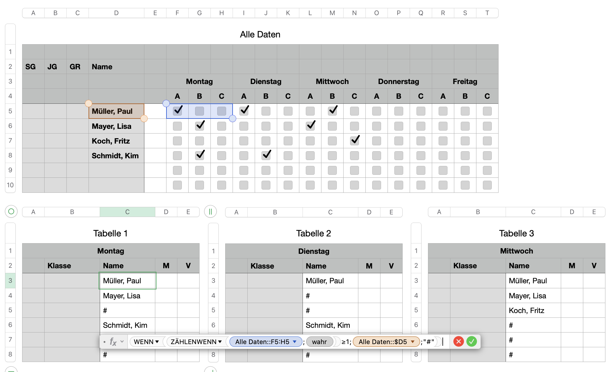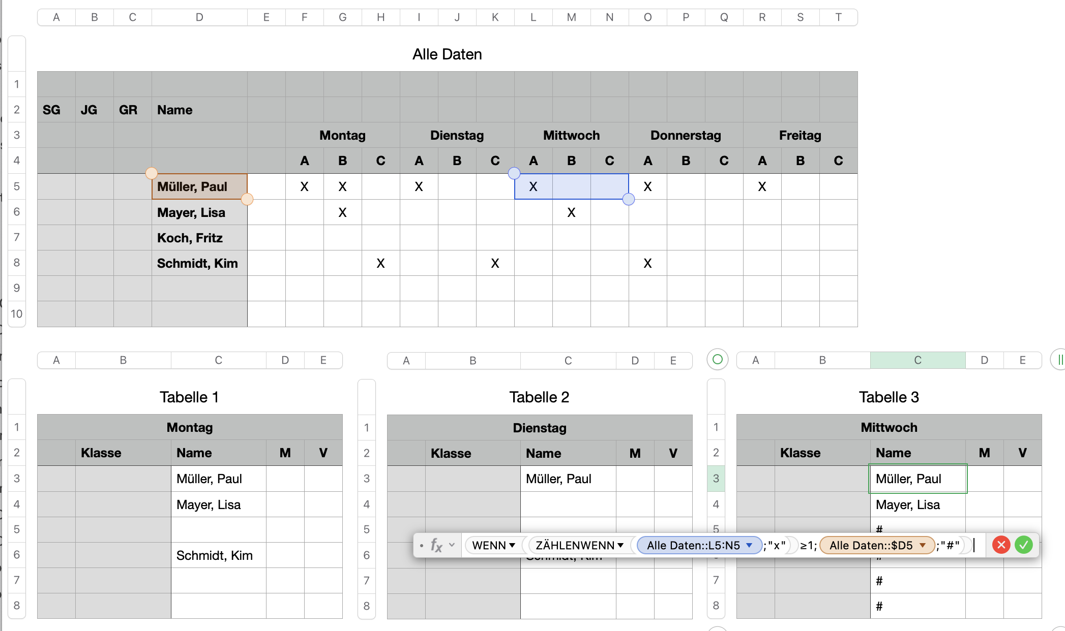Die Erste Seite ist eine lange Liste mit Namen, zu denen weitere Spalten existieren welche optionnal mit X markiert werden. Wenn zu einem Namen in der Zeile ein oder mehrere "X" auftauchen soll auf den weiteren Blättern der Name von Blatt 1 in dazu gehörige Zeilen eingesetzt werden. Egal was ich bisher probiert habe, ich bekomme immer nur Syntax Fehler gezeigt, ohne Hinweise wo der Fehler steckt. Es soll zB so aussehen.