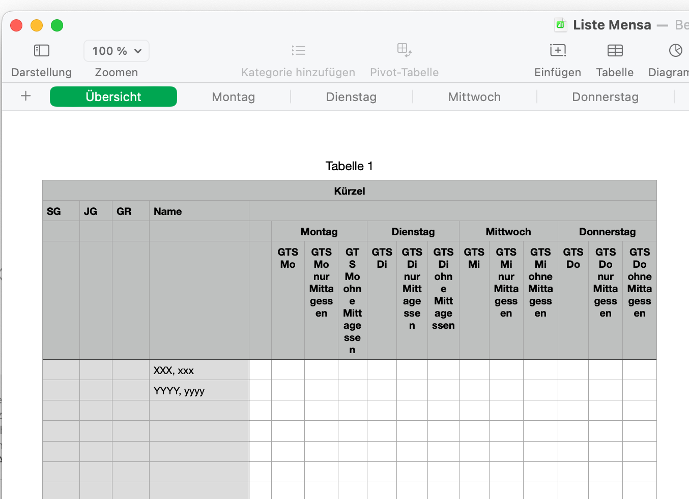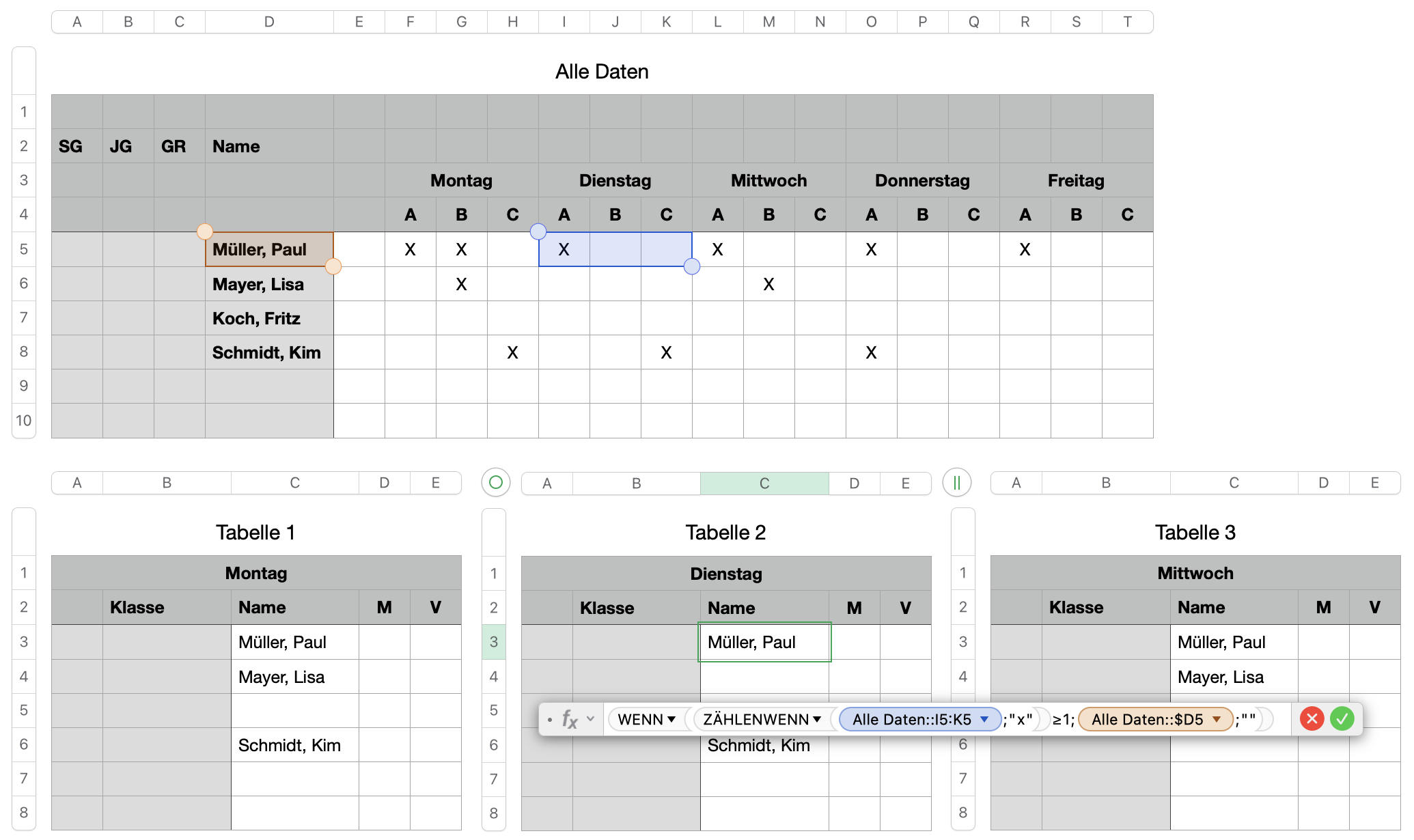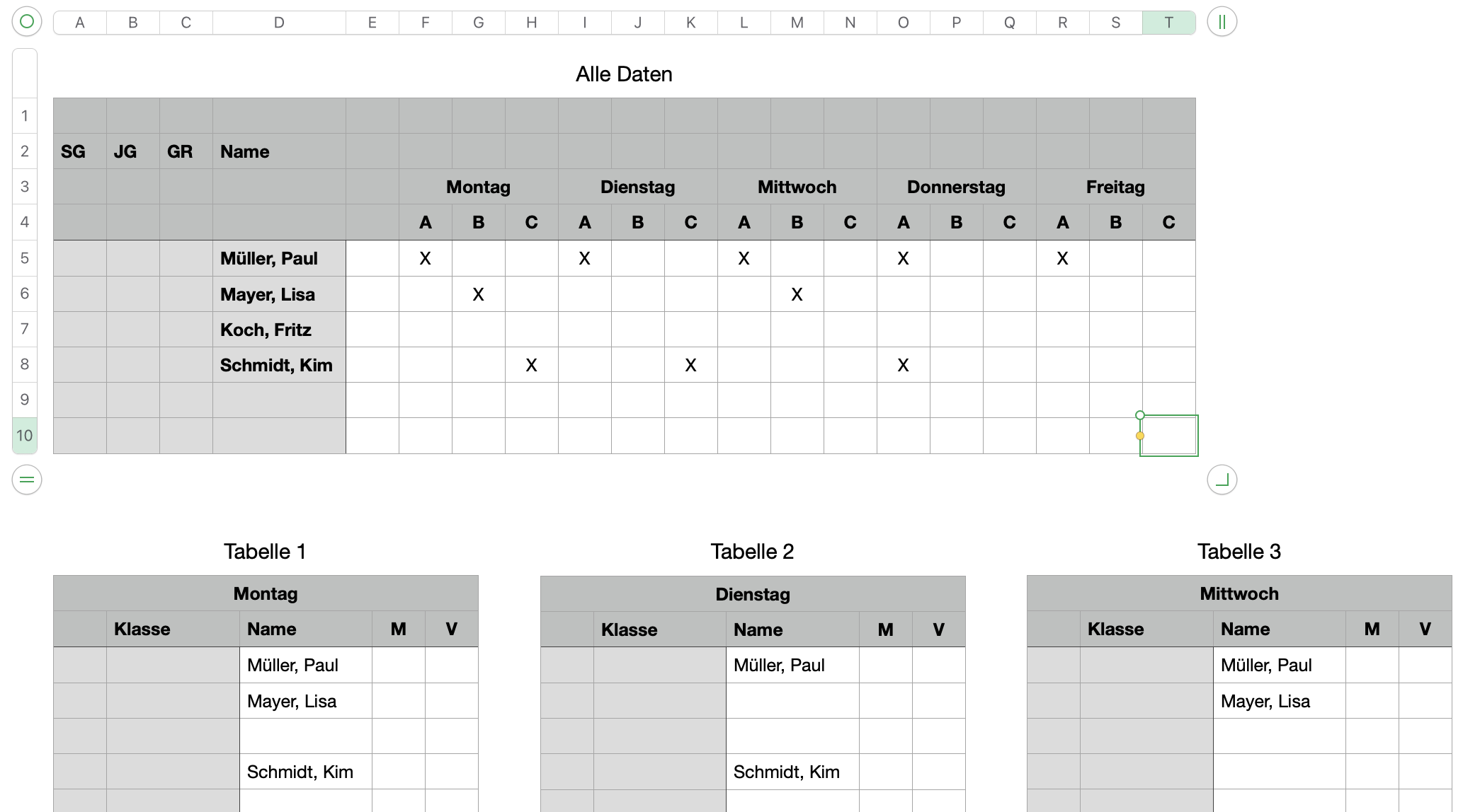 Die Erste Seite ist eine lange Liste mit Namen, zu denen weitere Spalten existieren welche optionnal mit X markiert werden. Wenn zu einem Namen in der Zeile ein oder mehrere "X" auftauchen soll auf den weiteren Blättern der Name von Blatt 1 in dazu gehörige Zeilen eingesetzt werden. Egal was ich bisher probiert habe, ich bekomme immer nur Syntax Fehler gezeigt, ohne Hinweise wo der Fehler steckt. Es soll zB so aussehen.