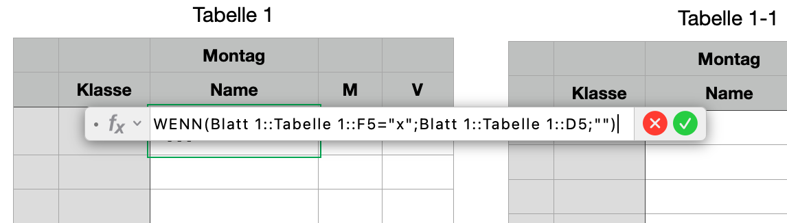 =WENN('Blatt 1'::Tabelle 1::F5="x", 'Blatt 1'::Tabelle 1::D5, "")