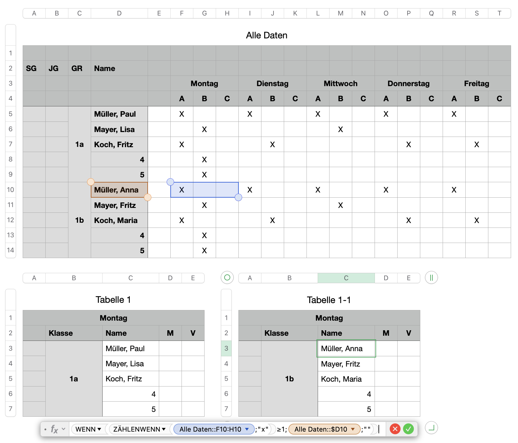 Wenn die Tabelle steht und funktioniert, sollen nur auf Blatt 1 Übersicht, die Namen und X ausgetauscht und ergänzt werden, und alle weiteren Blätter ( Wochentage ) sich entsprechend aktualisieren.