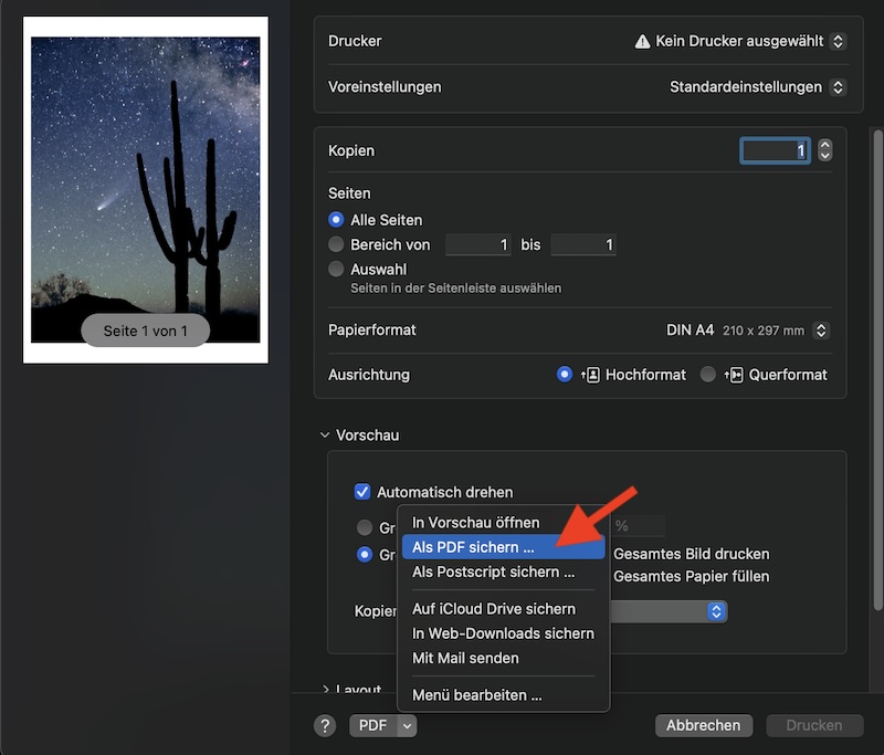 Aus dem "Drucken" Dialogfeld eine PDF speichern