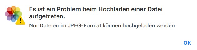 Hallo, die Videos sind von einer Action Kamera im *mov Format aufgenommen und per Speicherkarte auf dem Win PC abgelegt. Egal ob ich den Weg über Hochladen von der icloud Webseite oder per Drag Drop rüber schiebe, immer die gleiche Meldung : Es können nur Fotos im jpg Format hochgeladen werden. Die Dateien sind zwischen 30 und 500 MB groß. Die Systeme sind immer auf den aktuellsten Stand und in icloud habe ich noch 1,3 GB Freien Speicher.