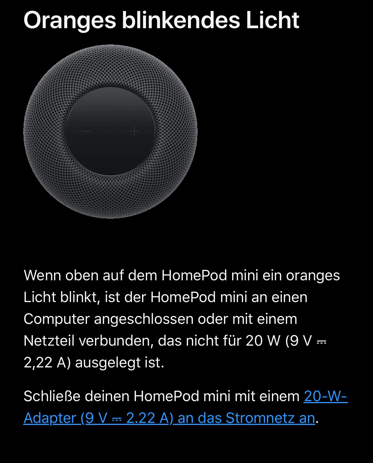 Ich habe mein HomePod mini an mein MacBook Pro über Kabel angeschlossen. Auch übers iPhone reagiert er nicht und blinkt nur mit roter LED. Blinkt ca. alle 2 Sekunden auf.