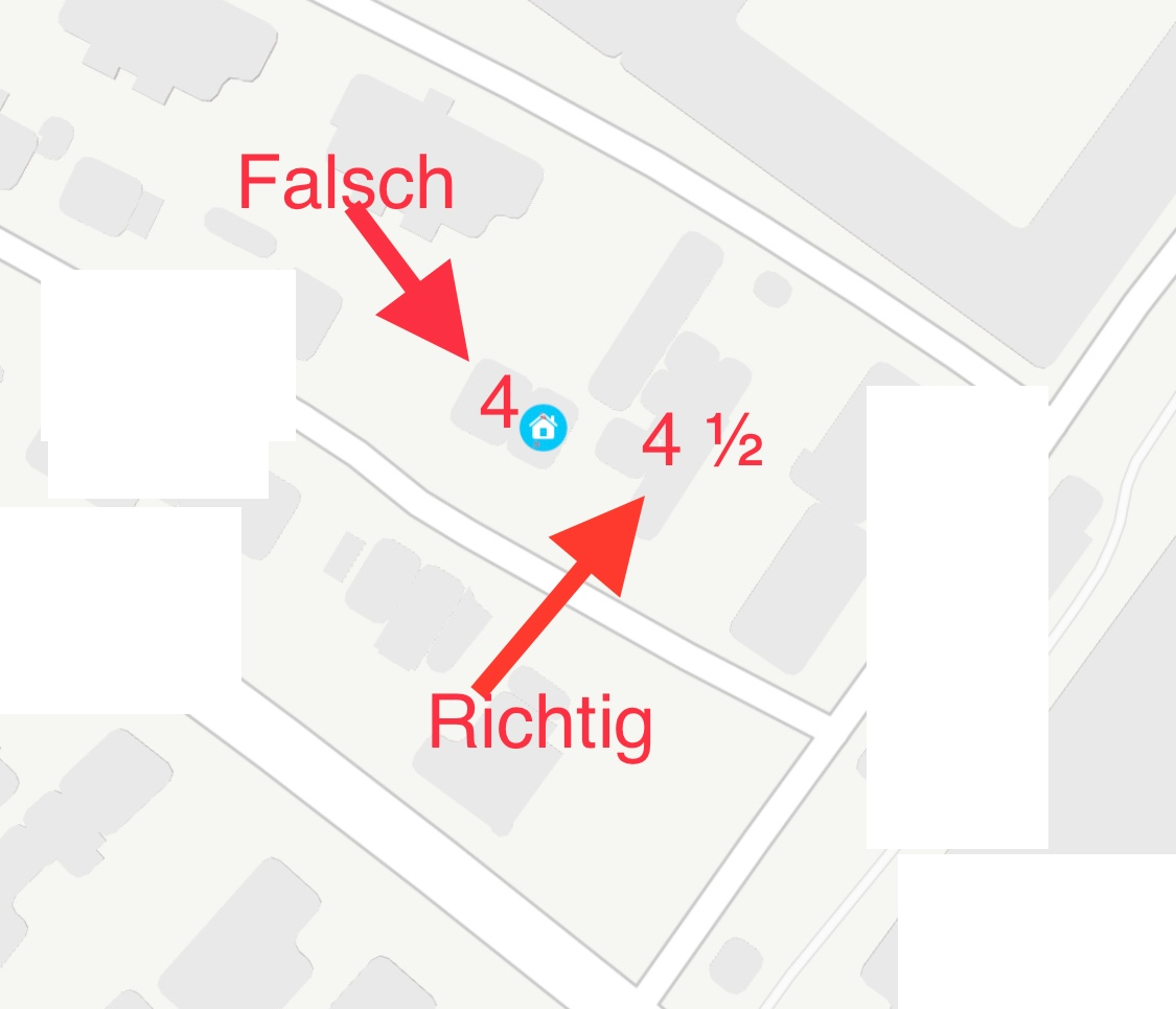 Es ist im Jahre 2023 beinahe unvorstellbar, dass Karten bei der Eingabe der Adresse die Hausnummer „4 1/2“ oder „4 ½“ nicht findet. Das betroffene Haus steht mindestens schon seit 1952 und hat seither diese Hausnummer.