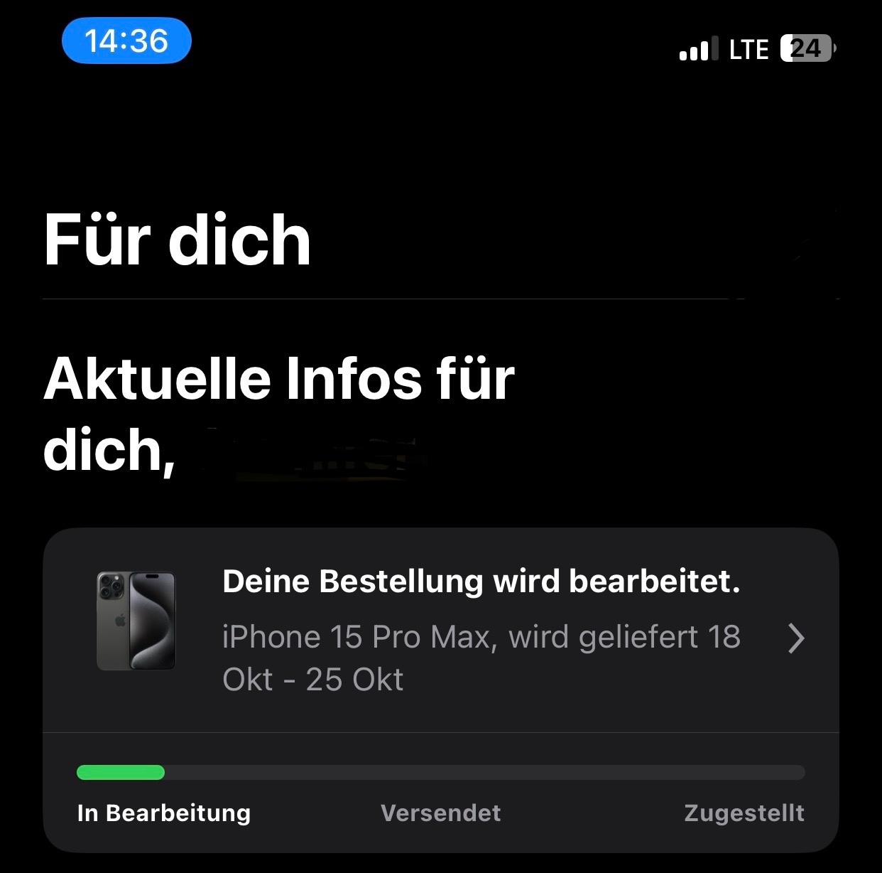 habe ca. 15 Uhr das neue iPhone 15 Pro bestellt und als Zahlart Finanzierung ausgewählt.