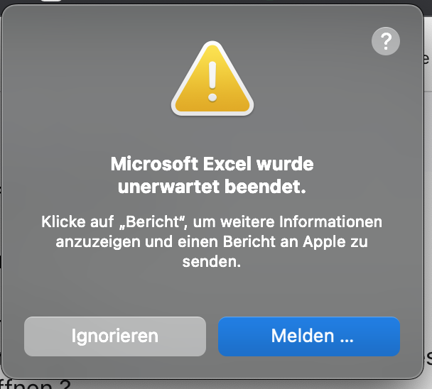 Ich hab erst heute gemerkt, dass sich Office Excel, Word usw. auf dem meinem MacBook Air M1 2021 Model nicht mehr öffnen. Es zeigt an "Microsoft Excel wurde unerwartet beendet". Nach etwas Recherche sah ich, dass das Problem immer wieder aufgekommen ist. Deshalb füge ich paar Daten vorab ein: