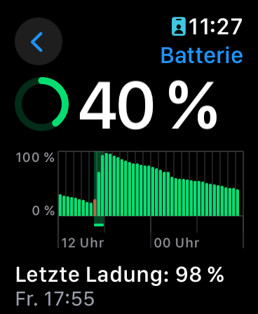 Nun schafft es die AppleWatch von 6:00 Uhr bis 23:00 Uhr durchzuhalten. Allerdings mit nicht zu viel „Spielerei“.