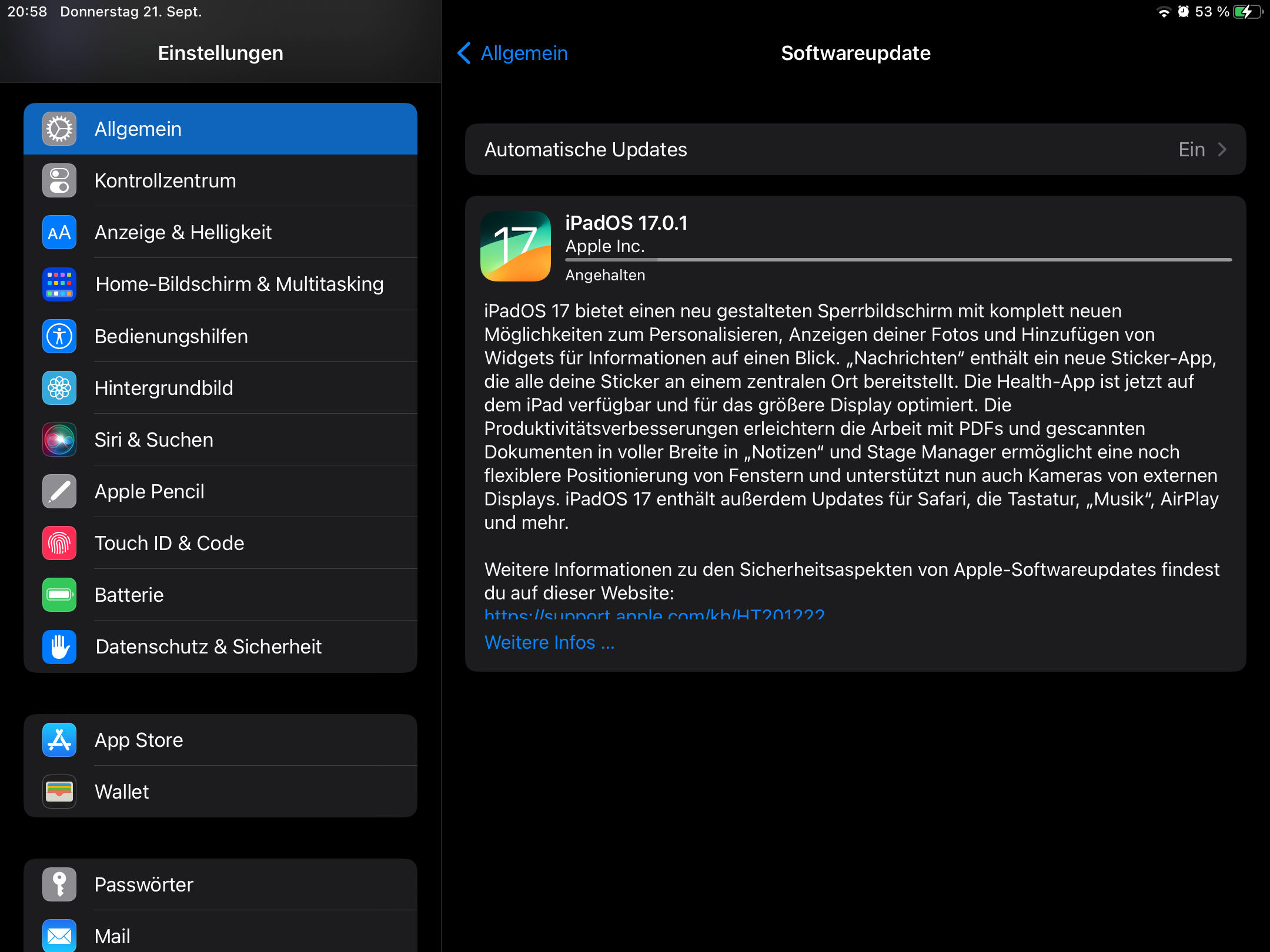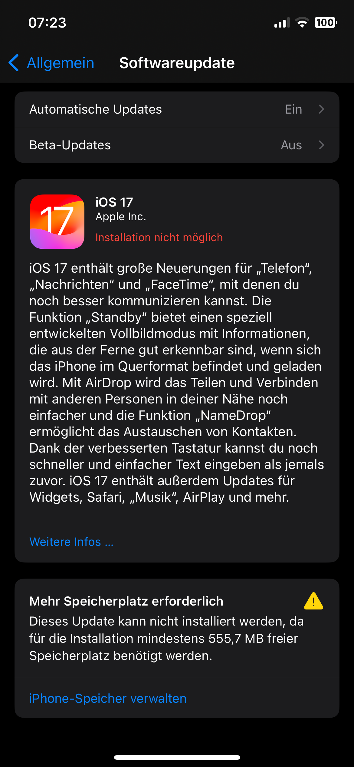 Guten Tag. iOS 17 ist mittlerweile draußen und ich habe bisher nur die Beta-Versionen. Jetzt möchte ich das offizielle iOS 17 herunterladen aber das funktioniert nicht, da nicht genügend Speicherplatz freigegeben ist. Es fehlen 500 MB, obwohl auf meinem Gerät noch gut 5 GB frei sind.