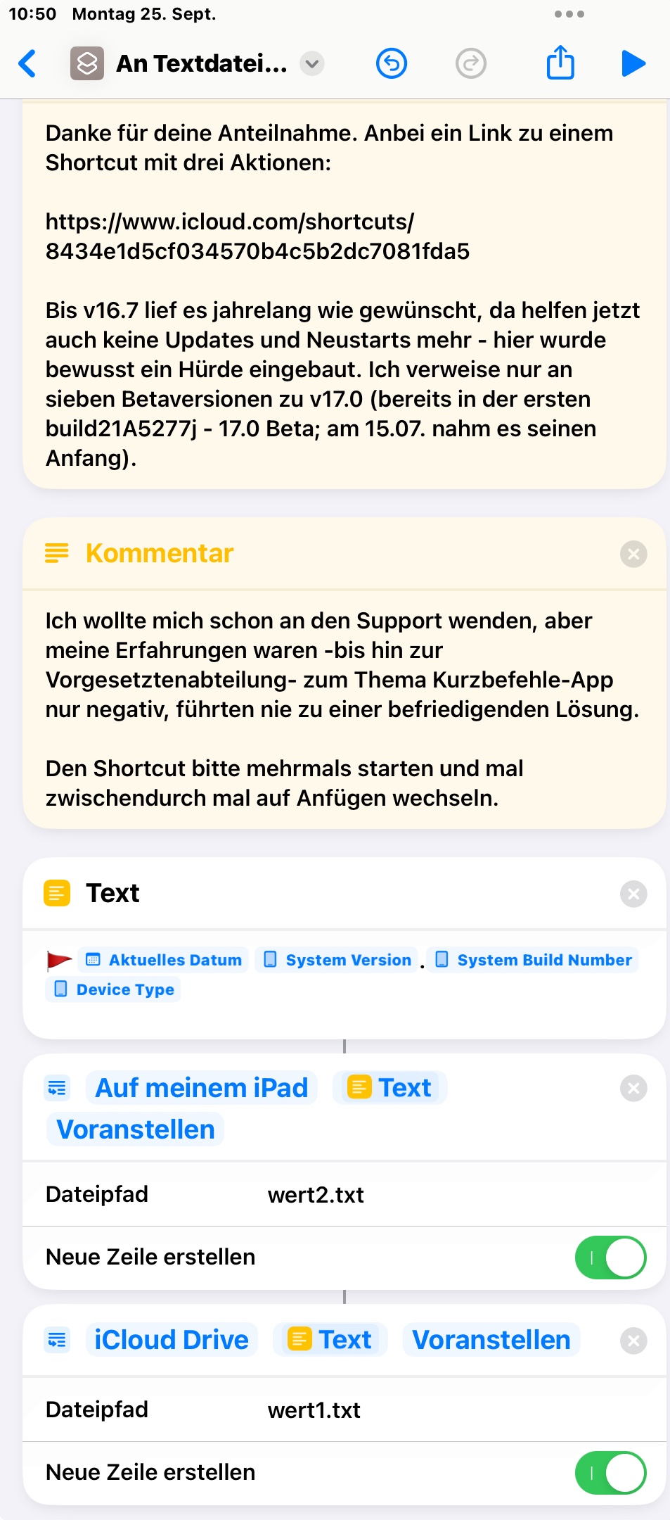 Ich wollte mich schon an den Support wenden, aber meine Erfahrungen waren -bis hin zur Vorgesetztenabteilung- zum Thema Kurzbefehle-App nur negativ, führten nie zu einer befriedigenden Lösung.