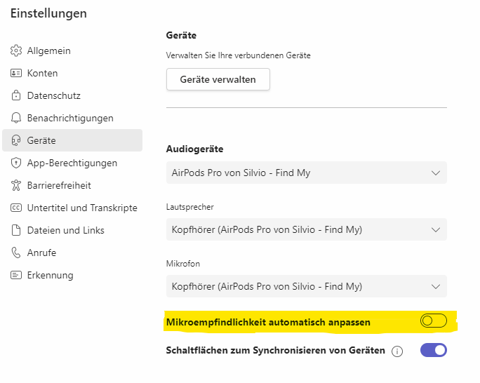 Andererseits funktionieren andere Bluetooth-Kopfhörer gut mit meinem MS Teams. Es kann also nicht an den Einstellungen von Teams liegen. Das Problem tritt nur bei der Kombination von AirPods Pro und MS Teams auf.