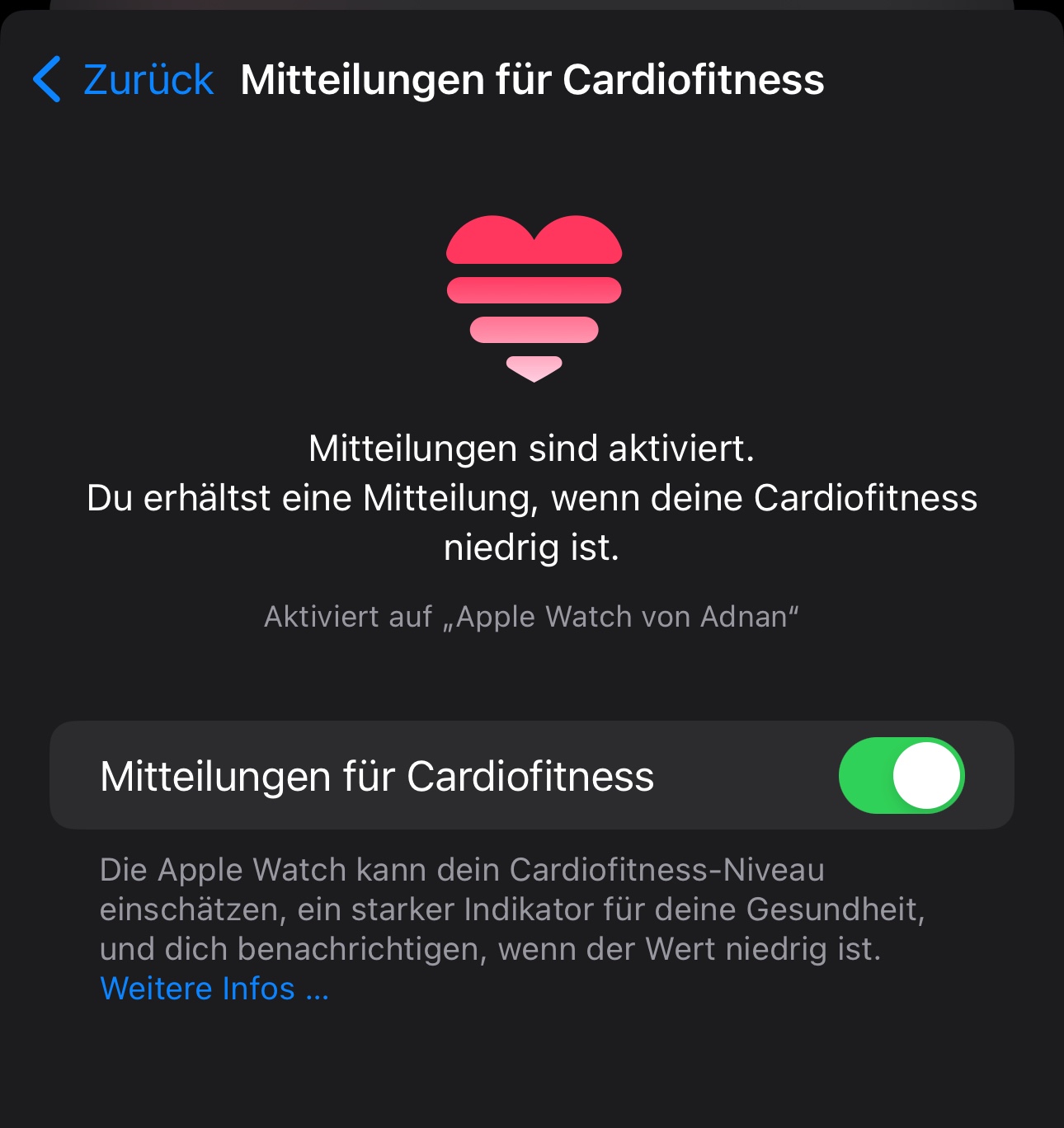 Wenn deine Cardiofitness für dein Alter und Geschlecht gering ist, erhältst du eine Mitteilung. Wenn deine Cardiofitness weiterhin niedrig bleibt, erhältst du zusätzliche Mitteilungen.