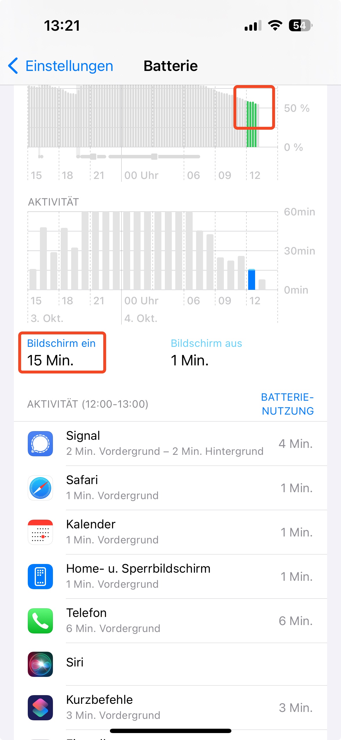 Im Bild sieht man, dass ich mein iPhone zwischen 12-13:00Uhr gerade mal 15min. in Nutzung hatte aber einige Prozente Batterieleistung verloren habe: