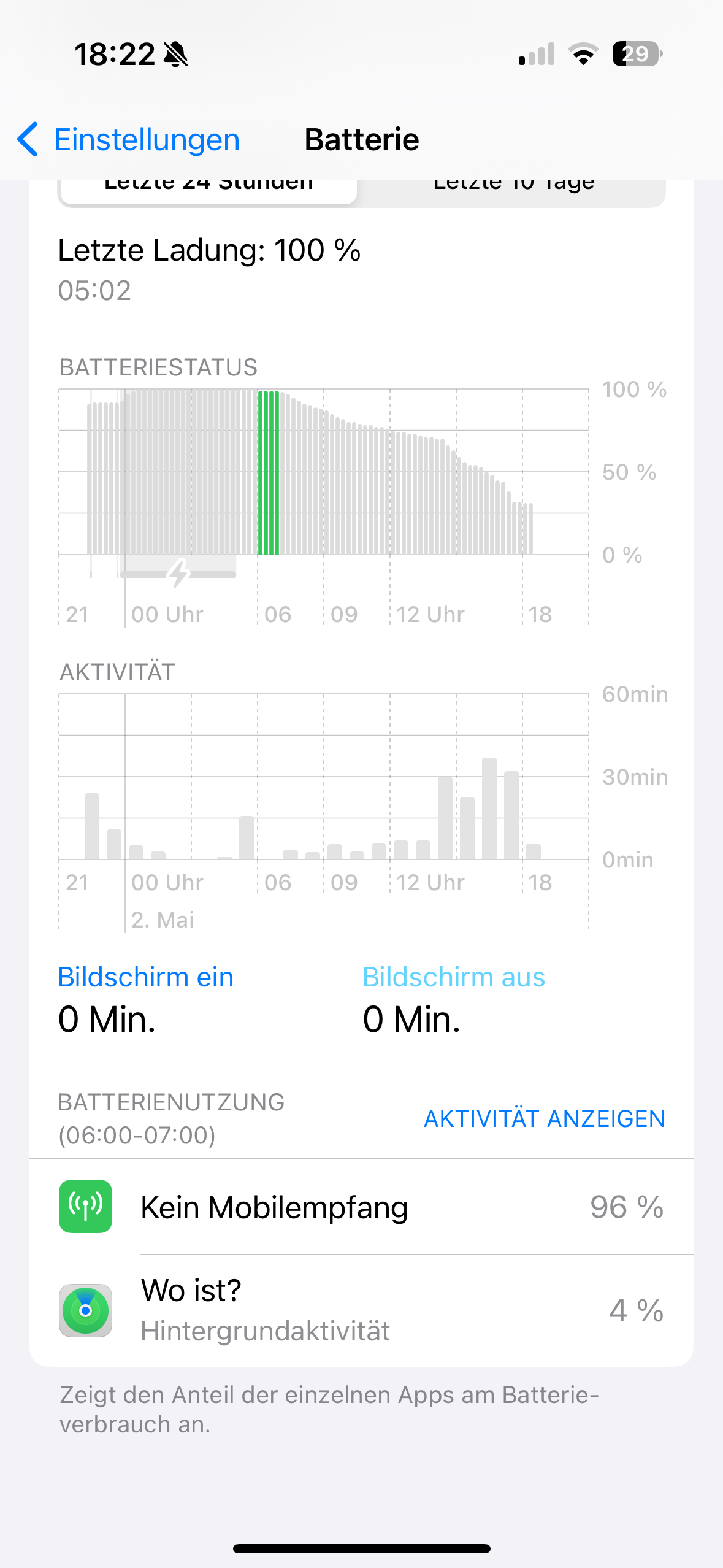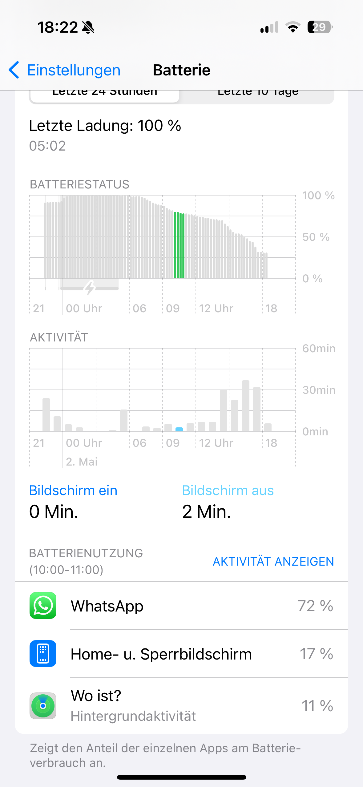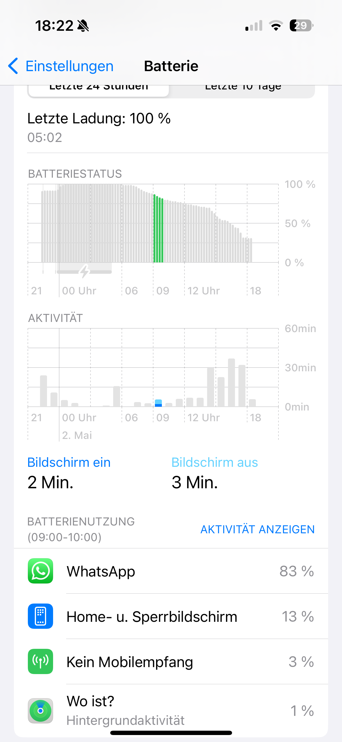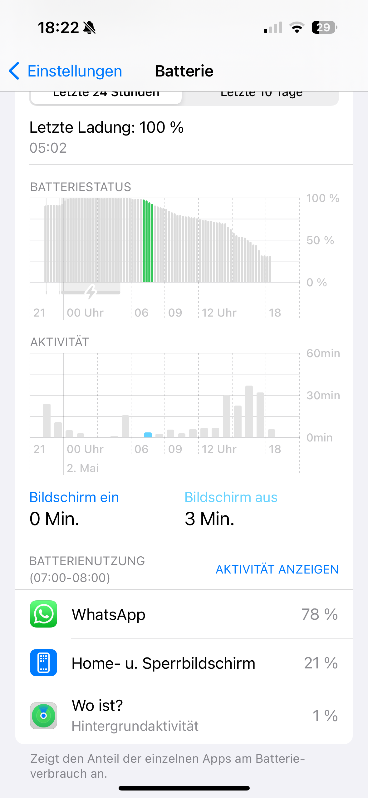 der Akku meines iPhone 15pro hat sich heute bei 5 Minuten Bildschirmzeit um 25% verringert. Nach anschließender Nutzung für 2h und 19 Minuten bin ich bei nur noch 29%.