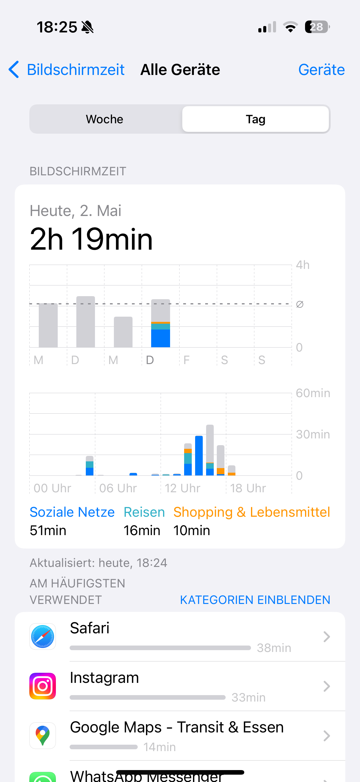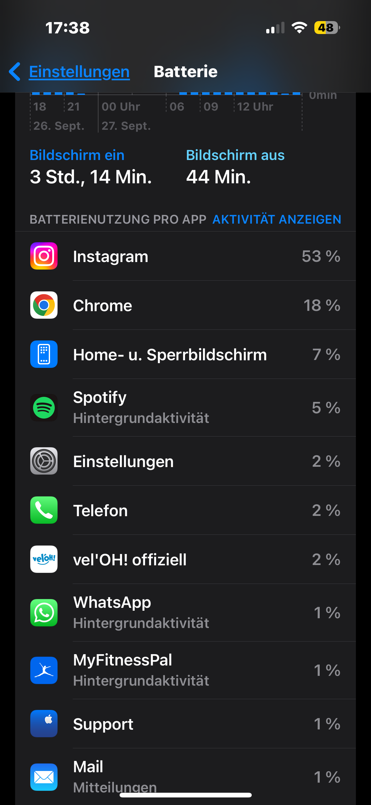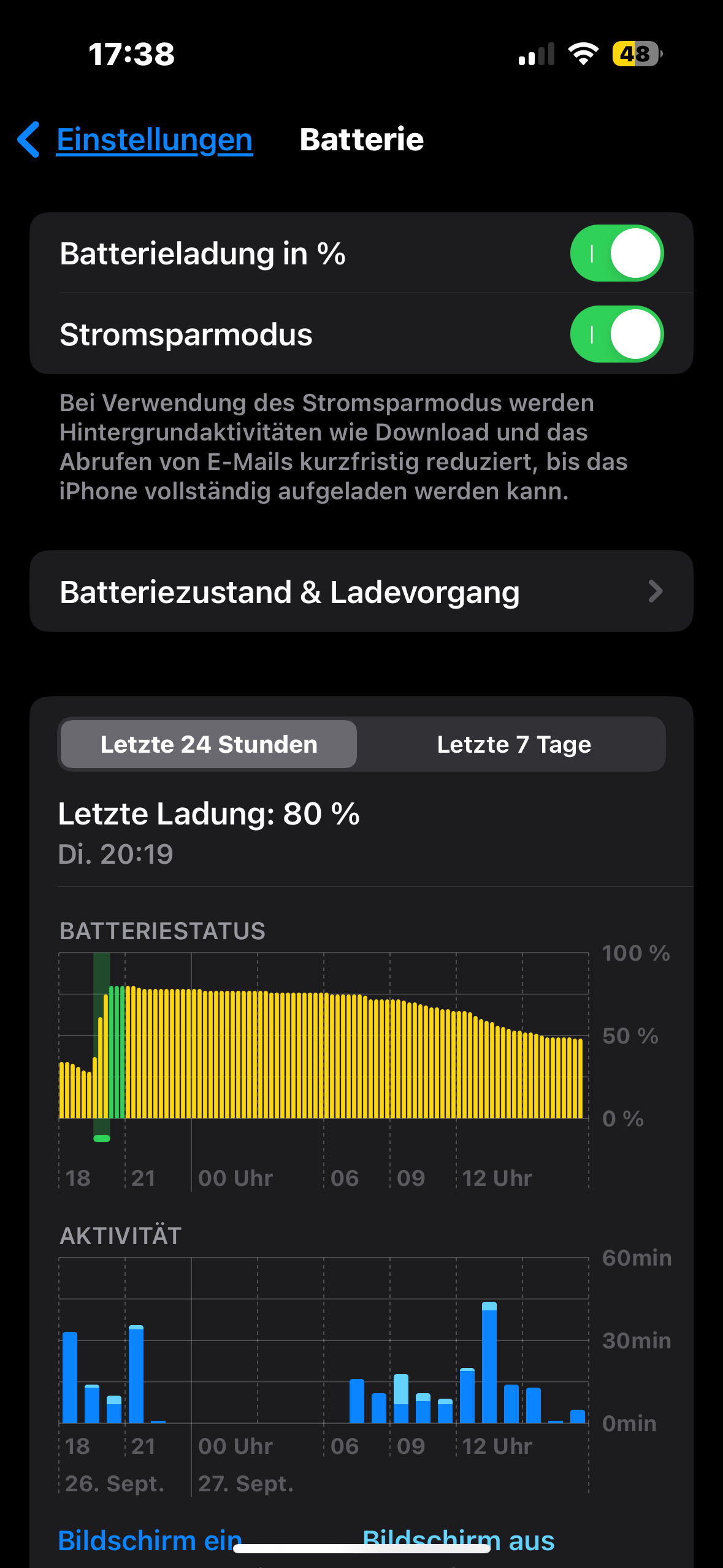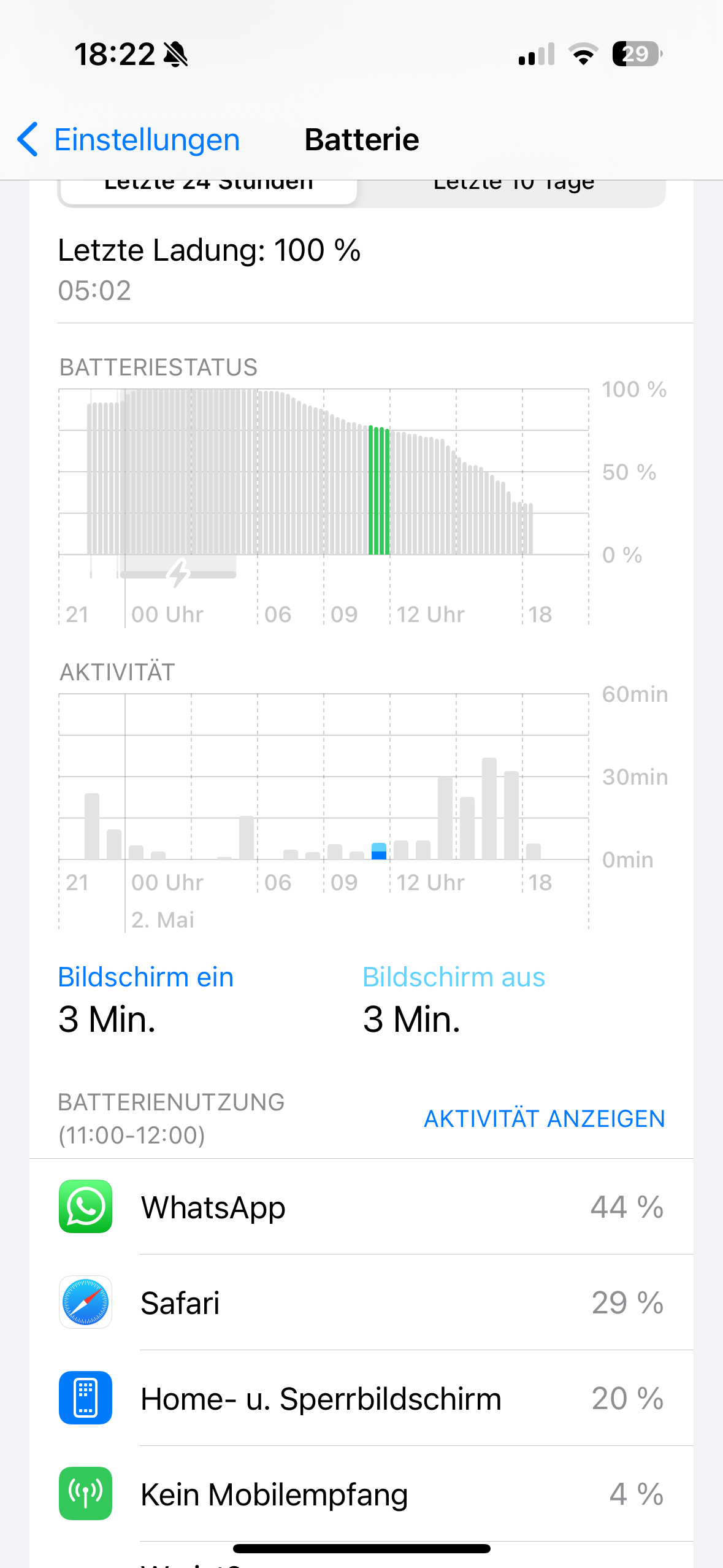 der Akku meines iPhone 15pro hat sich heute bei 5 Minuten Bildschirmzeit um 25% verringert. Nach anschließender Nutzung für 2h und 19 Minuten bin ich bei nur noch 29%.