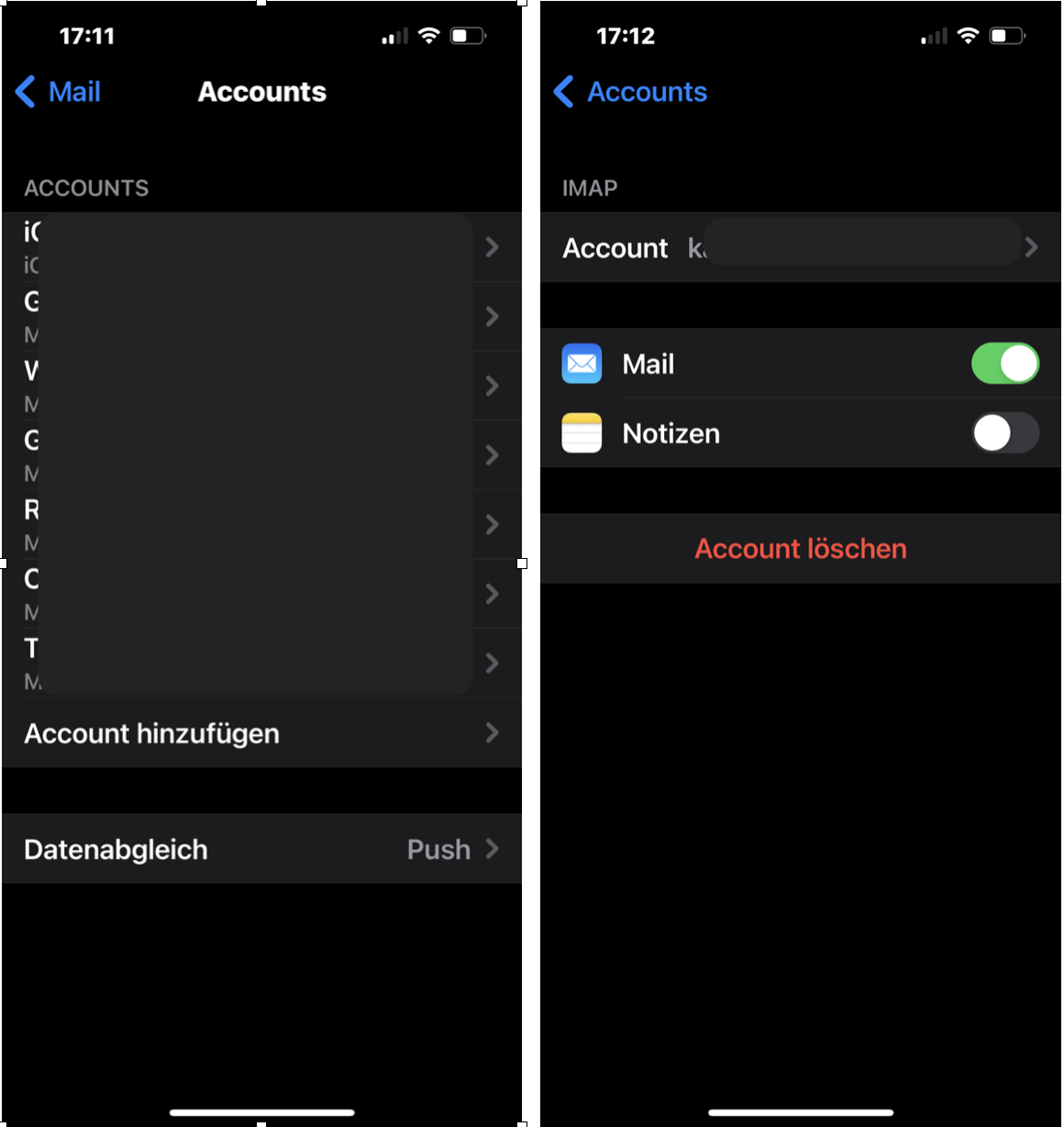 Suche deinen Account heraus, tippe diesen an und lösche ihn. Um den Account wieder einzurichten, gehe bitte wieder zu