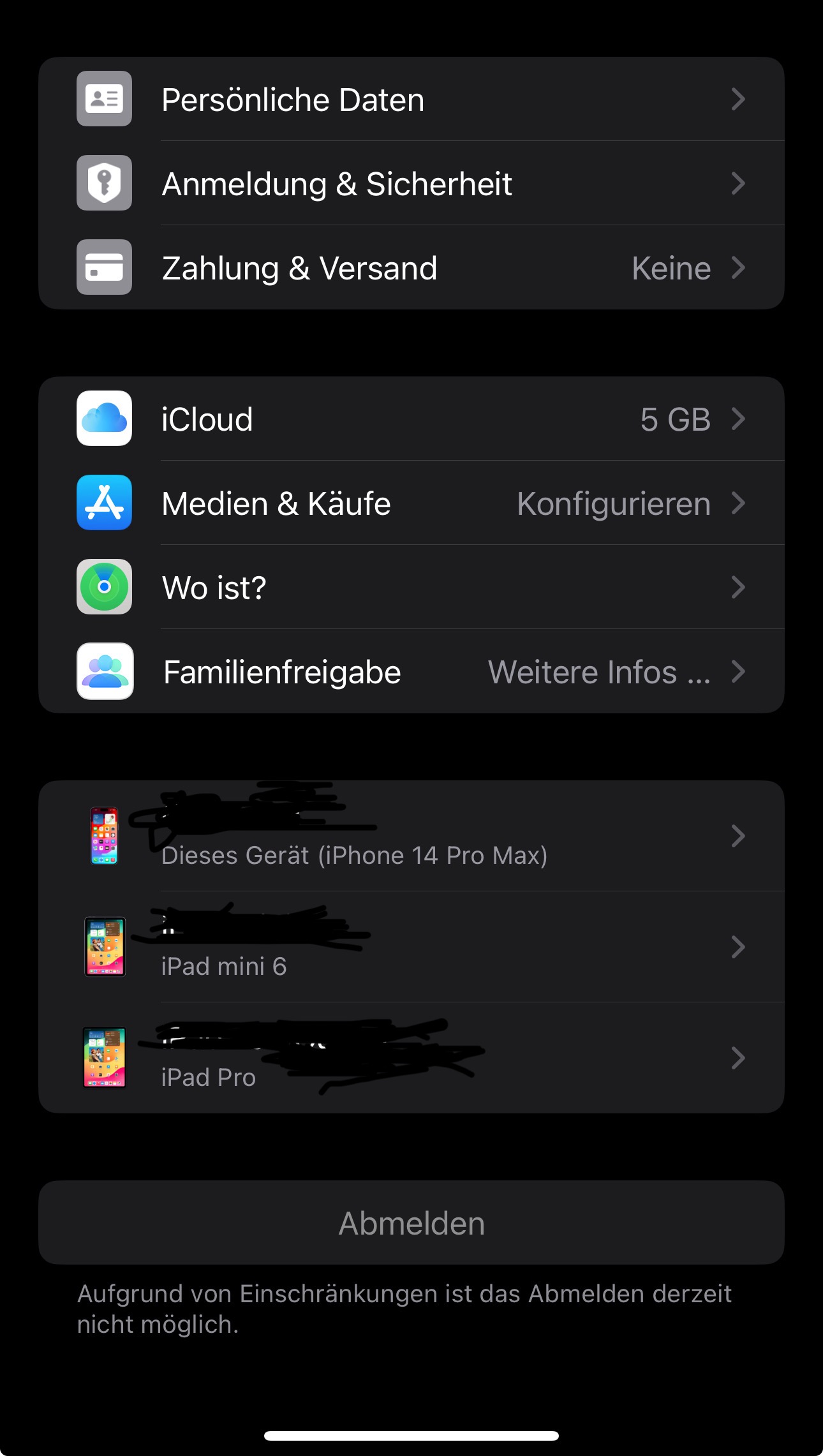 Eine Abmeldung von der iCloud funktioniert bei meinem Handy (iPhone 14 pro max) nicht (iOS 17.0.2). Der Eintrag „Abmelden“ ist ausgegraut und es gibt den Hinweis „Aufgrund von Einschränkungen ist das Abmelden derzeit nicht möglich“ Kann mir jemand sagen was ich tun muss, um die Abmeldung vornehmen zu können?