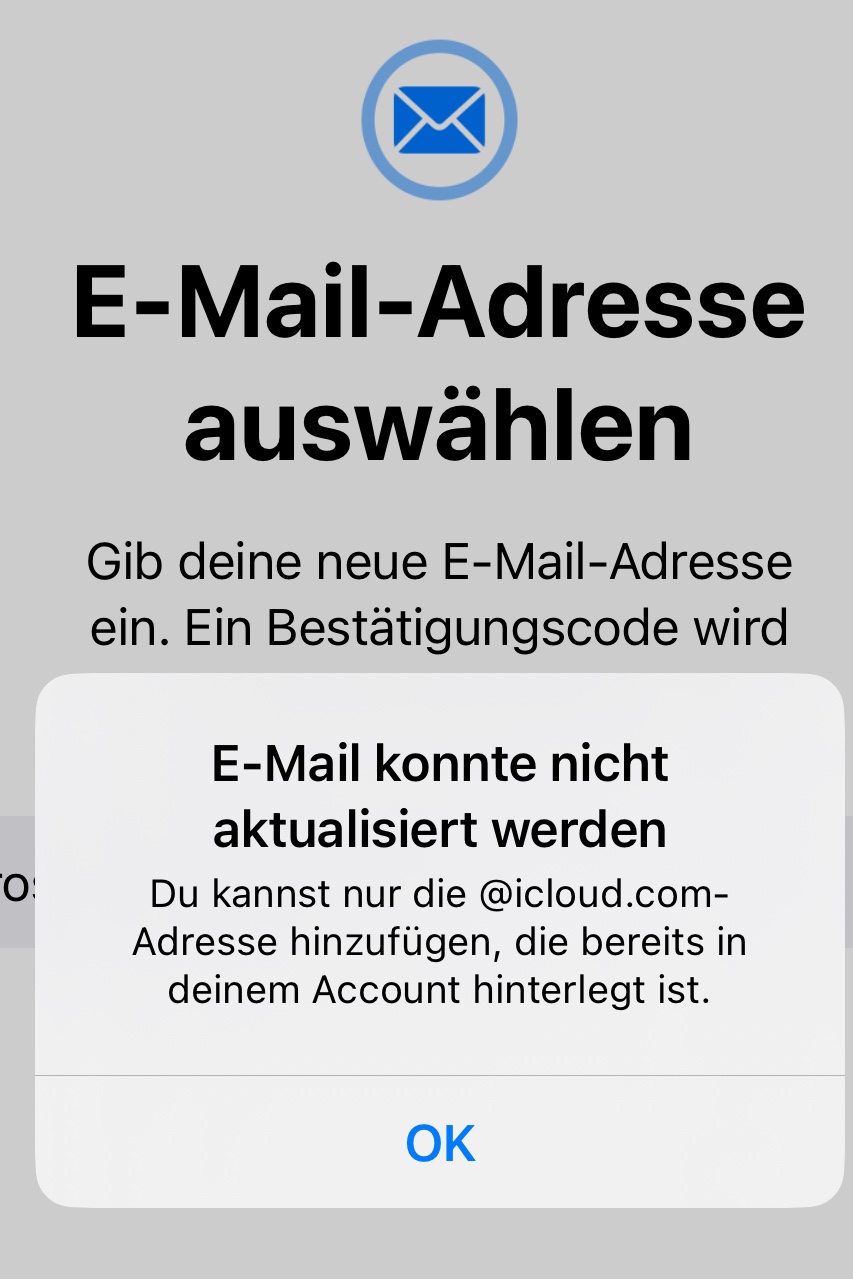 Wenn ich das versuche wird mir folgendes angezeigt. In meinem Account ist eine @iCloud Adresse hinterlegt.