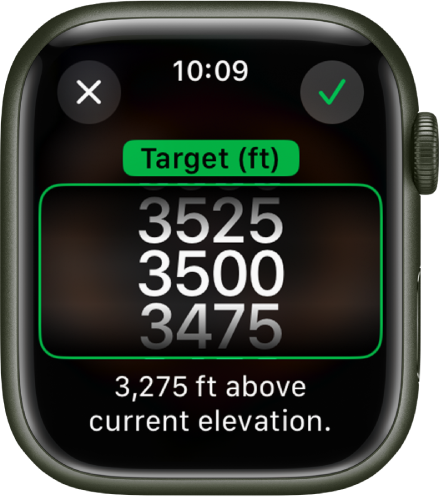 4. Zum Bearbeiten der Peilung tippst du auf , scrollst nach unten und tippst auf „Peilung“. Dann drehst die Digital Crown, bis die neue Peilung angezeigt wird, und tippst auf .