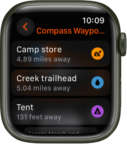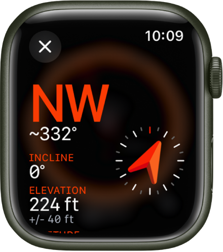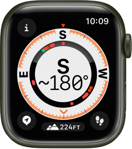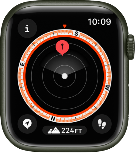 Die App „Kompass  zeigt die Richtung, in die deine Apple Watch SE oder Apple Watch Series 5 (oder neuer) weist, sowie die Koordinaten und die Höhe deines aktuellen Standorts. Auf der Apple Watch SE und Apple Watch Series 6 und neuer kannst du Kompass-Wegpunkte erstellen und anschließend die Entfernung und die Richtung zu jedem Wegpunkt ermitteln. Zudem kannst du dich benachrichtigen lassen, wenn du eine bestimmte Höhe überschritten hast; eine Schätzung des Punkts sehen, an dem deine Apple Watch zum letzten Mal eine Mobilfunkverbindung herstellen oder einen Notruf tätigen konnte; mit „Backtrack“ deine Schritte zurückverfolgen und mehr.