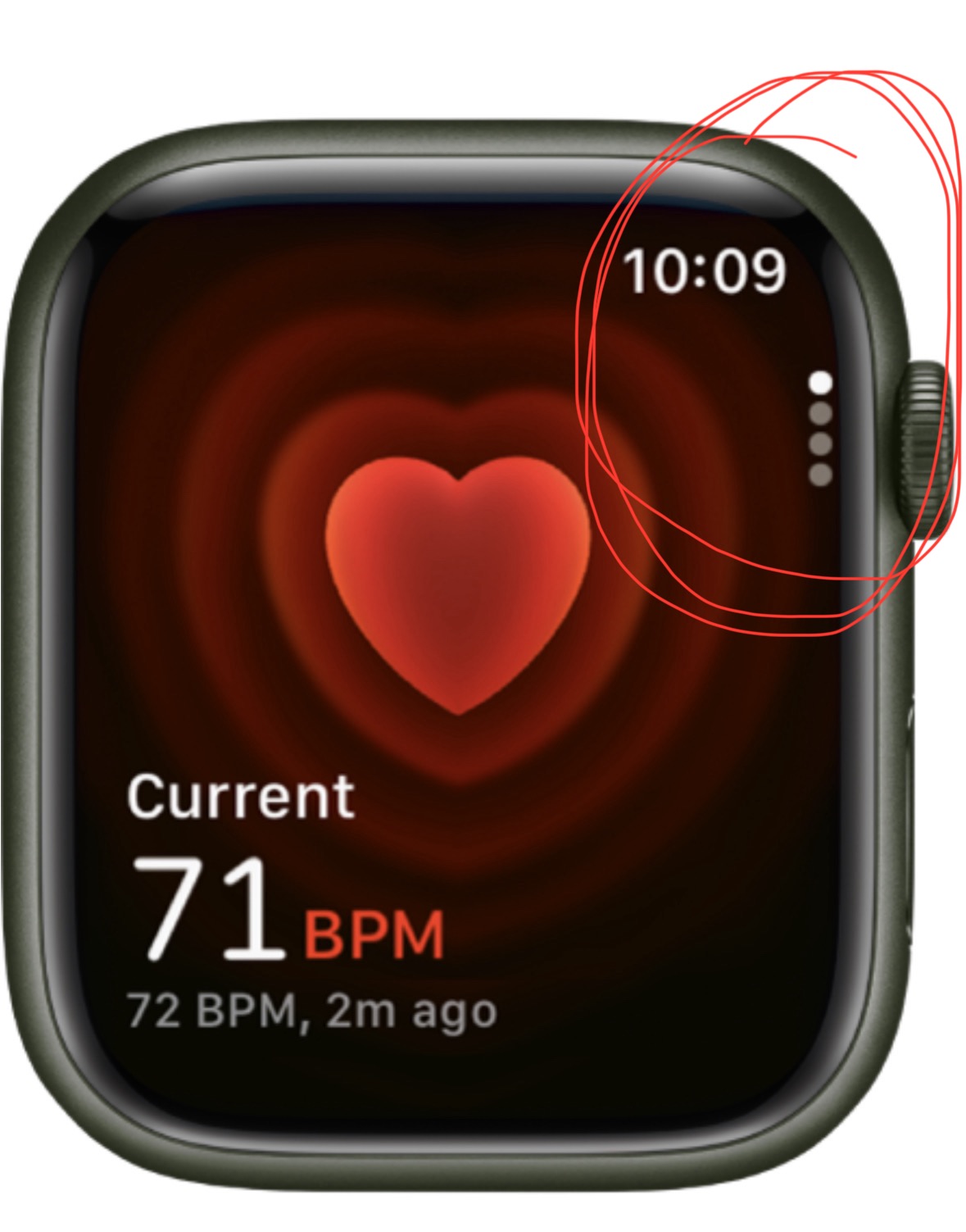 Die 4 Punkte neben der Digital Crown fehlen bei mir im Display, eigentlich müsste ich mit der Digital Crown zwischen den Ansichten wechseln können, kann ich aber nicht.