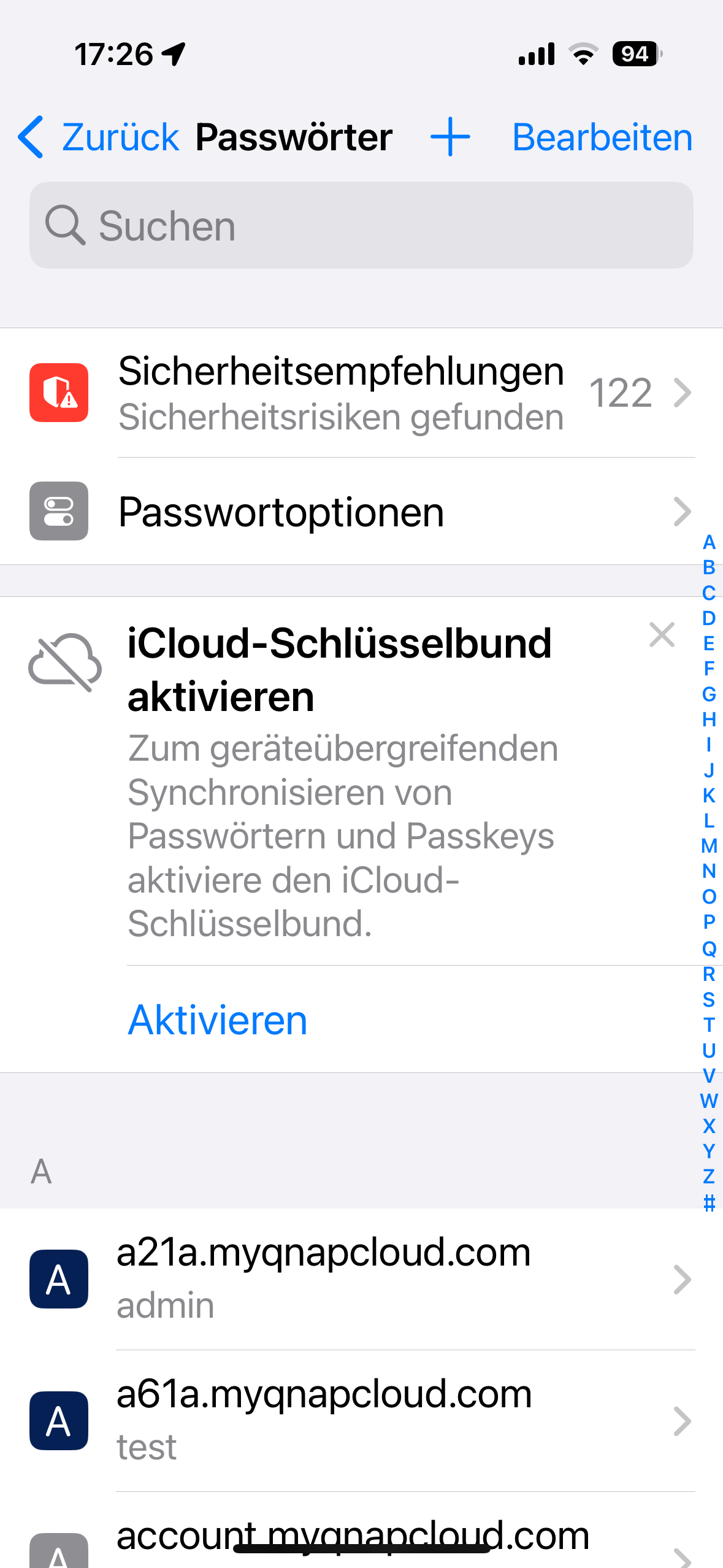 Ich möchte synchronisieren. In der iCloud Einstellung sind die Regler alle auf ein gestellt. Bei Passwörtern steht das dieser Dienst nicht aktiv ist. Wenn ich hier auf aktivieren klicke, komme ich zur Einstellung von iCloud. Wo ja bereits alles aktiv ist. Leider synchronisiert es aber nicht. Also wollte ich das synchronisieren ausschalten, es wurde nach dem Passwort gefragt (korrekt eingegeben) aber nichts passiert.