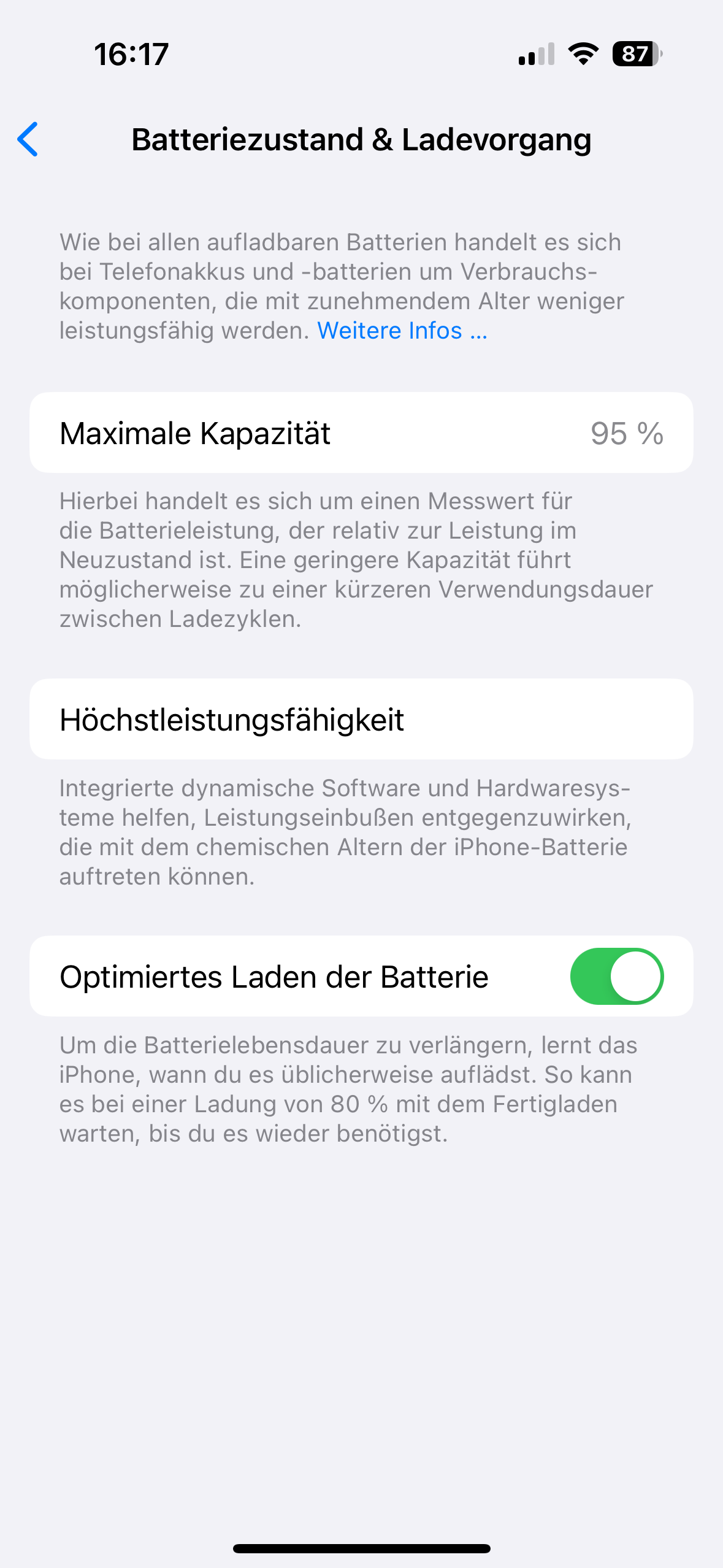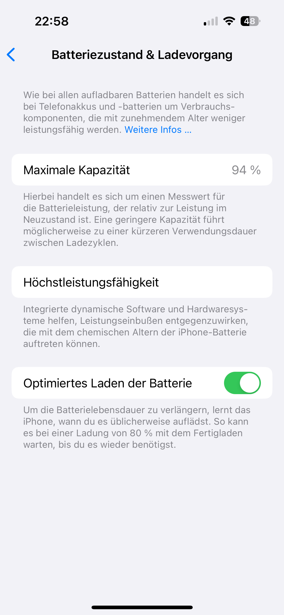Bei meinem iPhone 14 Pro, welches ich September 2022 erworben habe, kann ich ähnliches Phänomen betrachten. Bei mir sinkt der Batteriezustand mittlerweile im Wochen-Rhythmus und ist nun bei mittlerweile 94% angekommen. Im Oktober 2023 standen da noch 100%. Leider habe ich nur Screenshots von dieser Woche und von letzter Woche, wo da noch 95% standen.