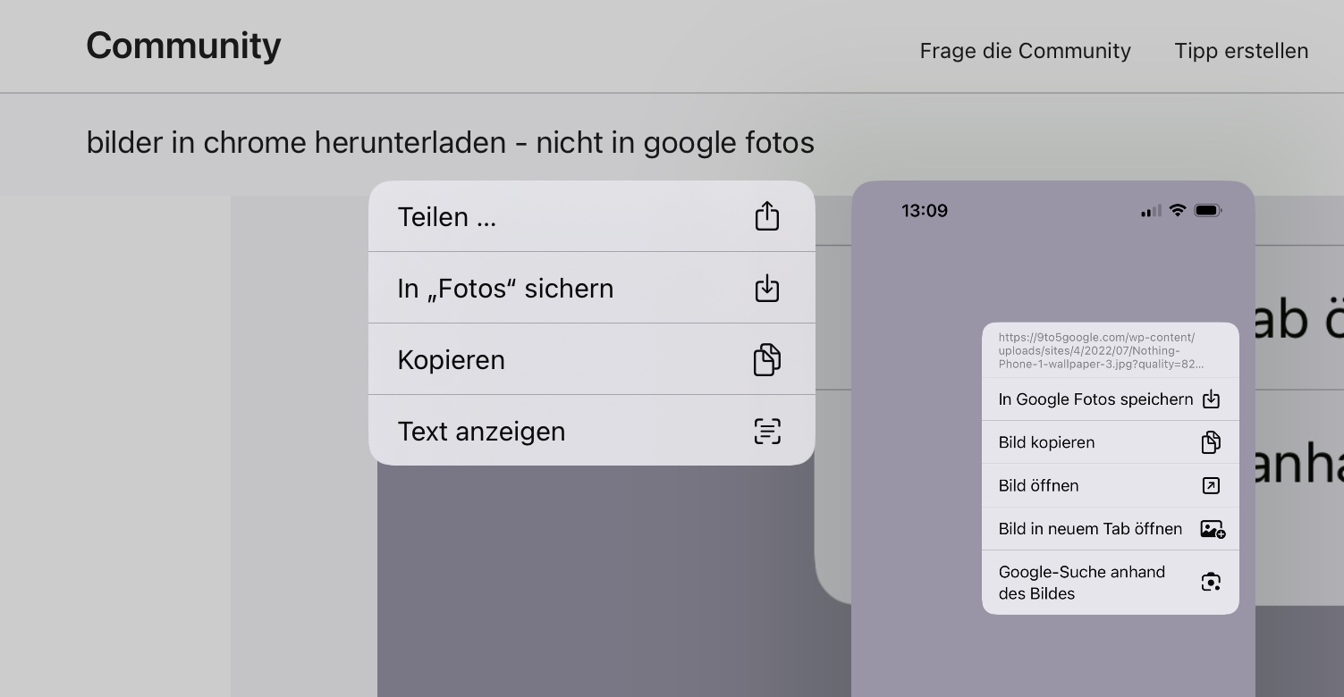 auf dem iphone in chrome bekomme ich fuer das runterladen eines bildes als erste option „in google fotos speichern“ und nicht (wie auf dem ipad) die option „bild speichern“.
