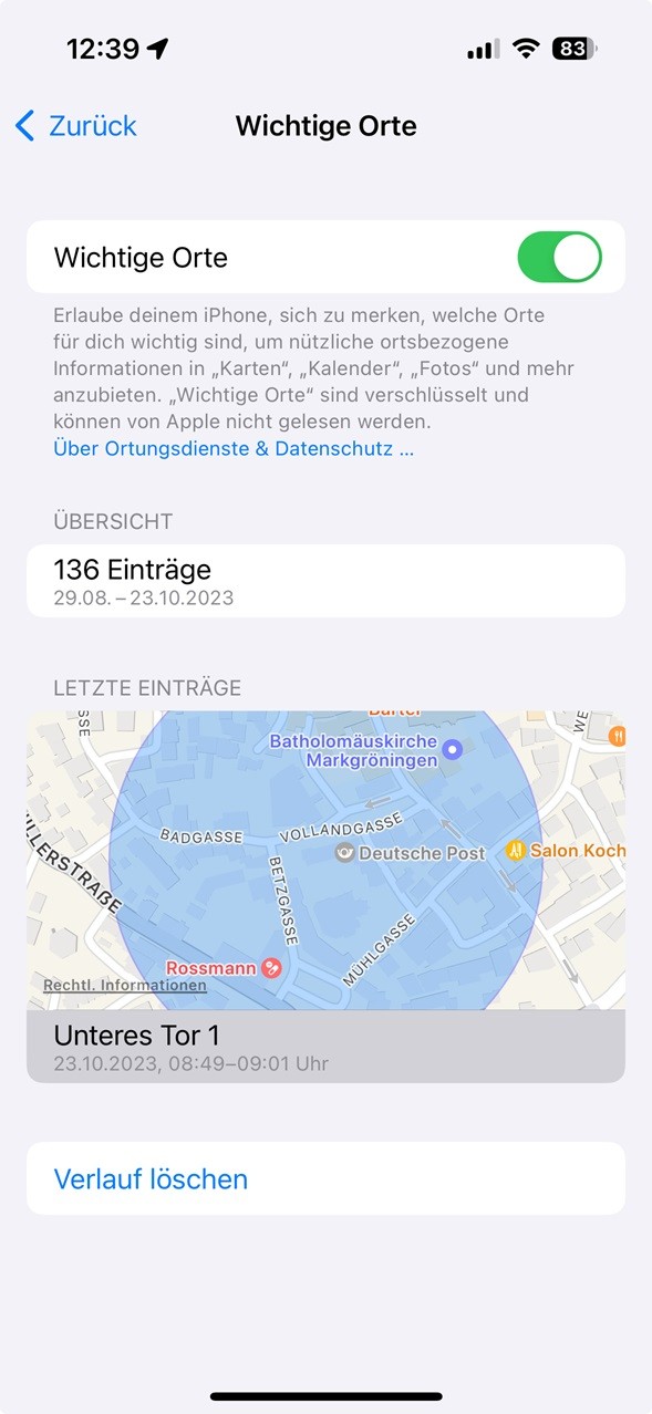 Nach dem Kauf wurde das IPhone 12 (ios 16.6.1) bis zu Systemdienste - wichtige Orte - auf EIN gestellt. Rufe ich nun wichtige Orte auf, werden nur die letzten Einträge angezeigt, auf die Einträge der Übersicht (über 200) kann ich nicht zugreifen. Die ebenfalls angezeigte Karte mit dem letzten Standort reagiert auf touch, ebenso kann ich die drei letzten Orte aufrufen.