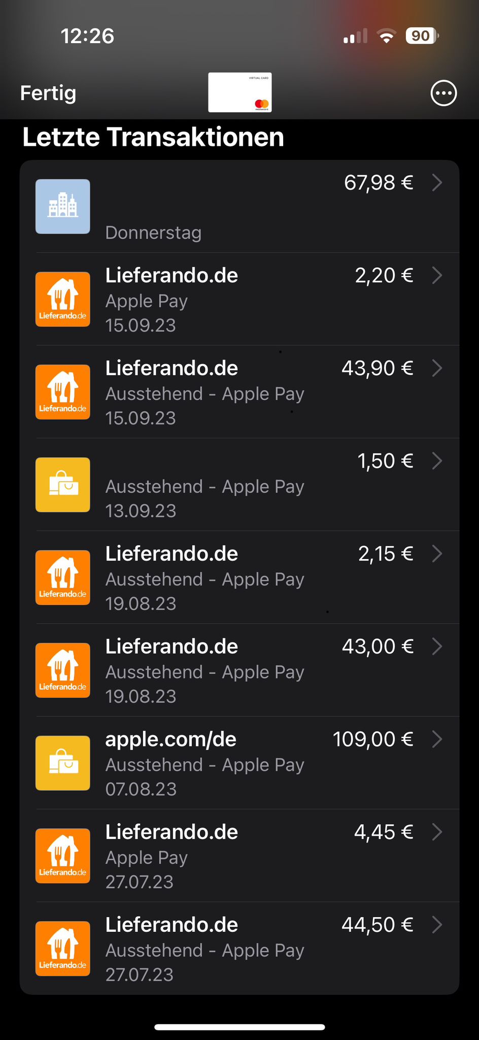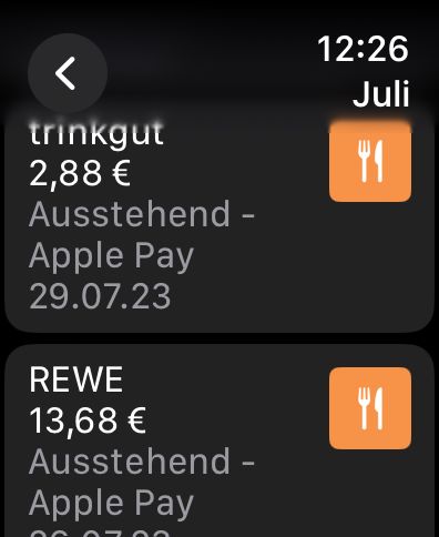 Die Zahlungen werden dann in der Wallet app (Sowohl iPhone, als auch AppleWatch) als "Ausstehend" gelistet. Nicht alle. Allerdings sehr viele. Wenn Ich in meine Onlinebanking app schaue ist der status meistens nach einem Tag schon von "Ausstehender MasterCard Zahlung" zu "Bezahlt" gewechselt, allerdings in der Wallet App immernoch als "Ausstehend" gelistet.