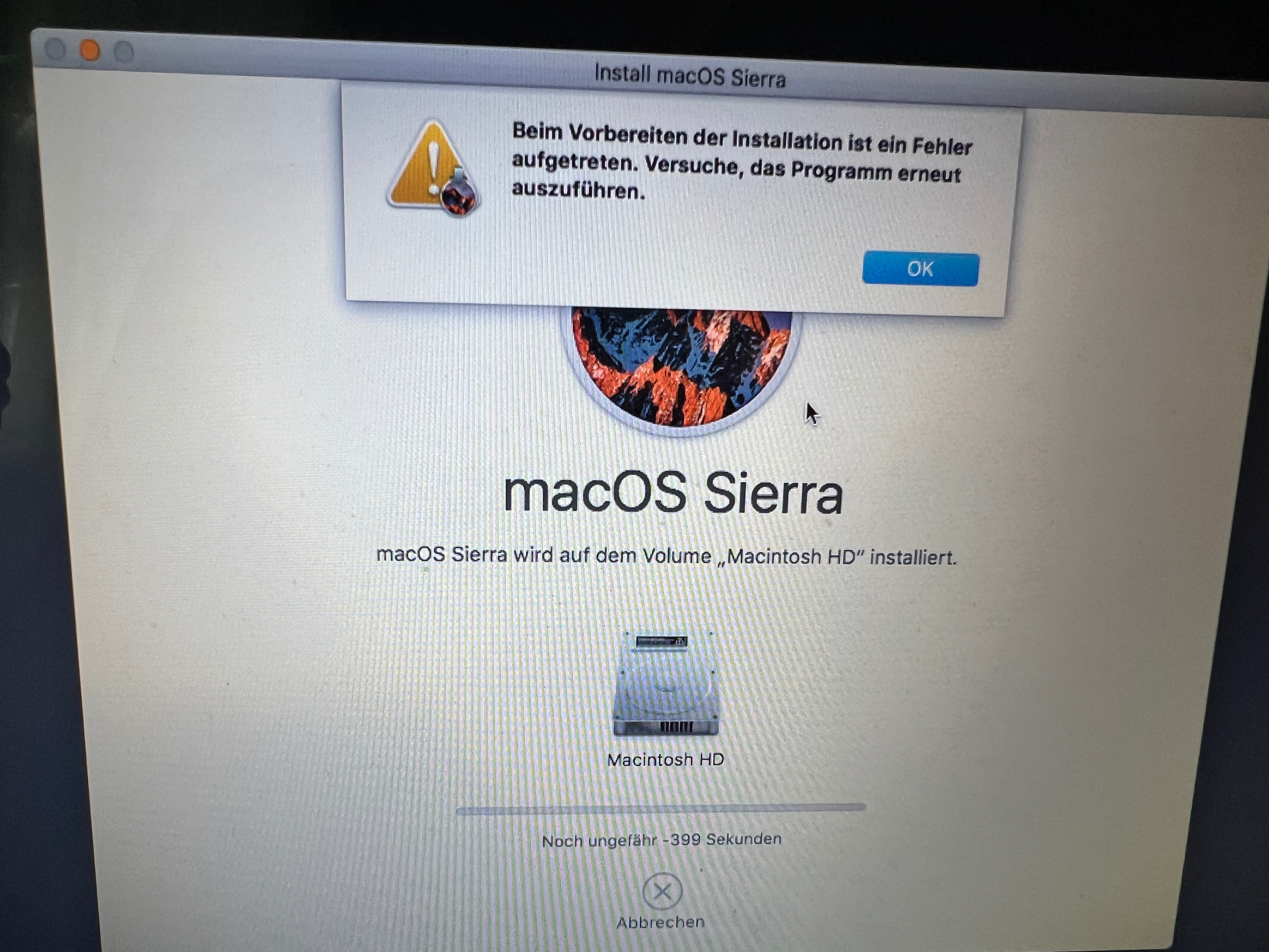 Ich habe einen Macbook air 2015 gekauft und der Verkäufer hat den MacBook formatiert. Jetzt muss ich feststellen, dass ich macos drauf booten muss. Ich musste feststellen, dass ich beim letzten schritt immer eine Fehlermeldung bekomme.