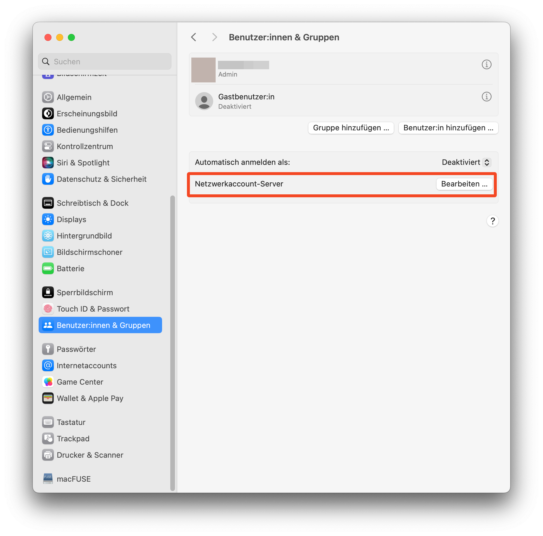 Der Nutzer ist in den Systemeinstellungen korrekt eingetragen.