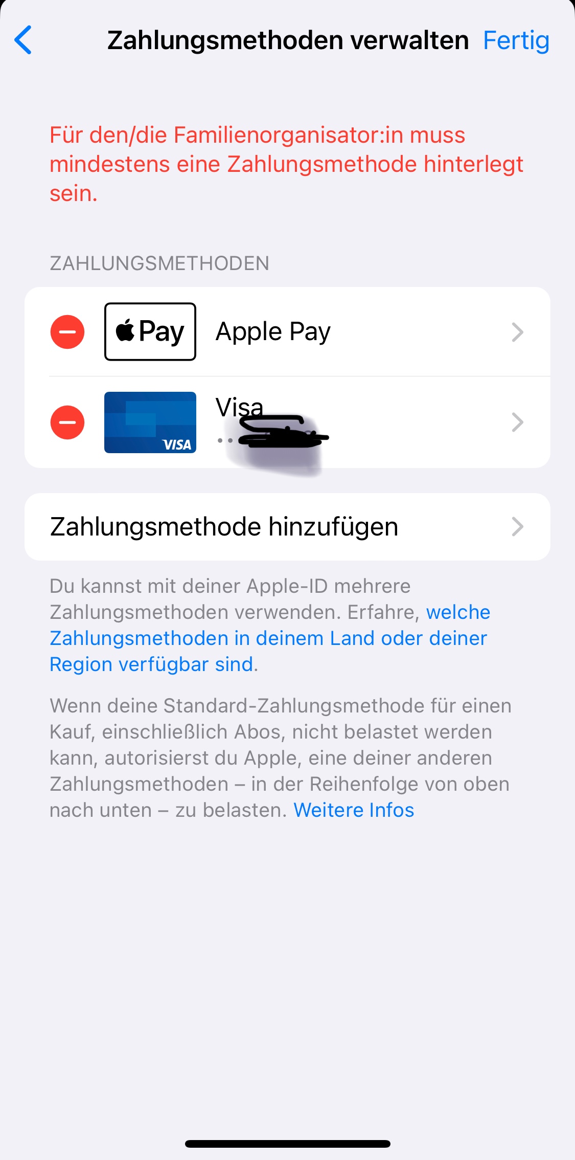 Wie man am Screenshot sieht, sind 2 Zahlungsmethoden verfügbar. Trotzdem bekomme ich beim Versuch die Visa zu entfernen die ersichtliche Fehlermeldung. Apple - was soll dieser unlogische Mist?