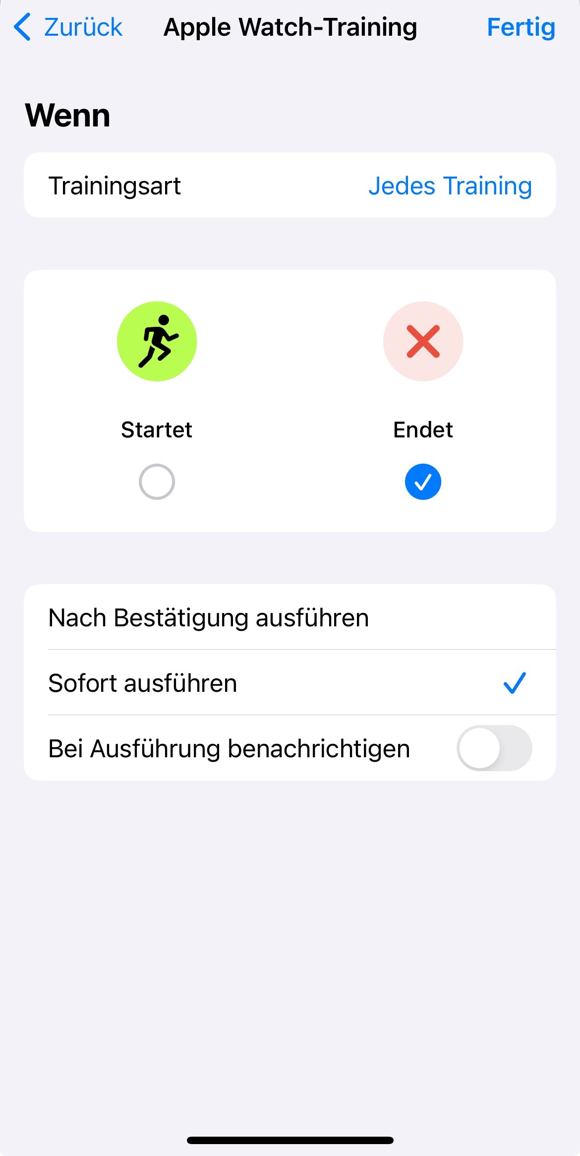 ich würde gerne eine Apple Watch Automation für das Ein- bzw. Ausschlalten des Theatermodus festlegen, sobald ein Training gestartet bzw. beendet wird.