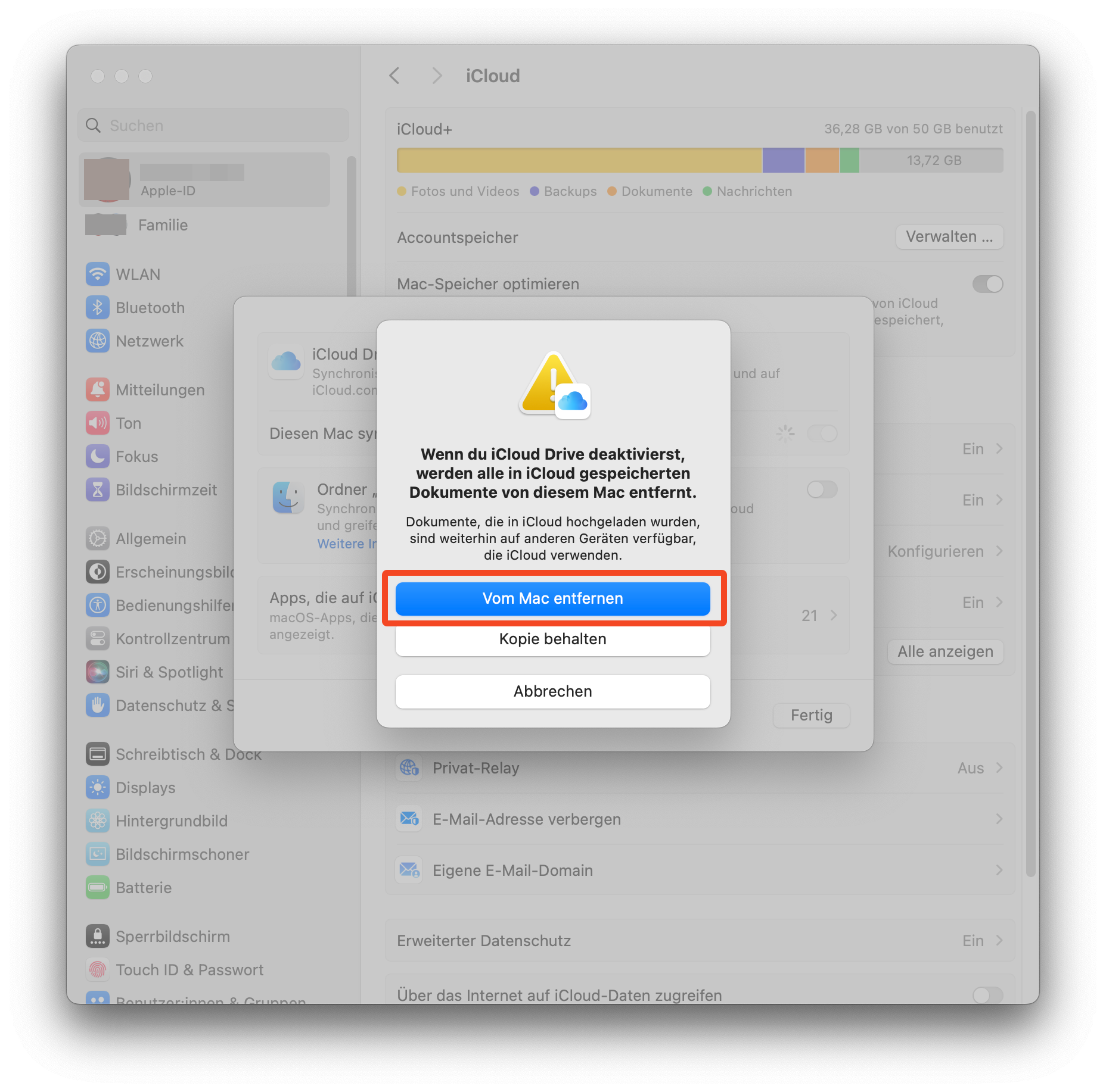 * Vermeide das Speichern von App-Ordnern, Mediatheken, .tmp-, .vmdk-, .vmware-, .vbox-, .vm- und .pvm-Dateien in iCloud Drive.
