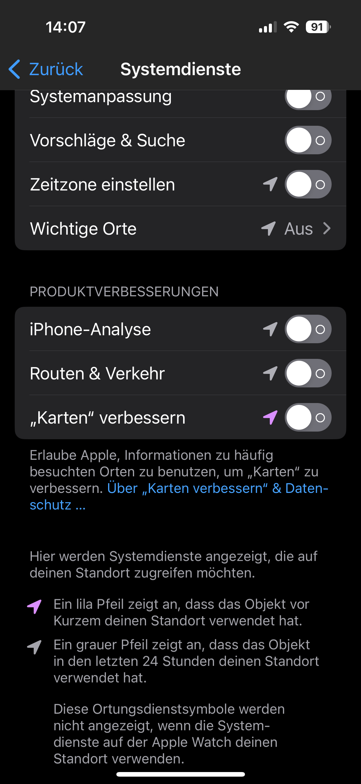 ...hier erstmal 2 Beispiele, wie ich das mitbekommen habe, dass mit den Standortdiensten etwas nicht stimmt. Gestern waren dann plötzlich die Standortdaten für alle Systemdienste aktiviert. Habe die umgehend wieder alle deaktiviert. Heute wurde mir wieder das Pfeil-Symbol neben der Uhr angezeigt. Nachgeschaut, "Karten verbessern" hatte den Standort genutzt, obwohl es deaktiviert war. Daraufhin habe ich die Standortdaten komplett (auch für alle Apps) deaktiviert. Telefon weggelegt. Nach 30min schaue ich wieder auf das Telefon. Die Standortdienste waren wieder an und alle Systemdienste waren wieder aktiviert. Jetzt habe ich (wie im 1. Post erwähnt) die Standortdienste erneut komplett deaktiviert und die Änderung selbiger über Bildschirmzeit>Einschränkungen untersagt.