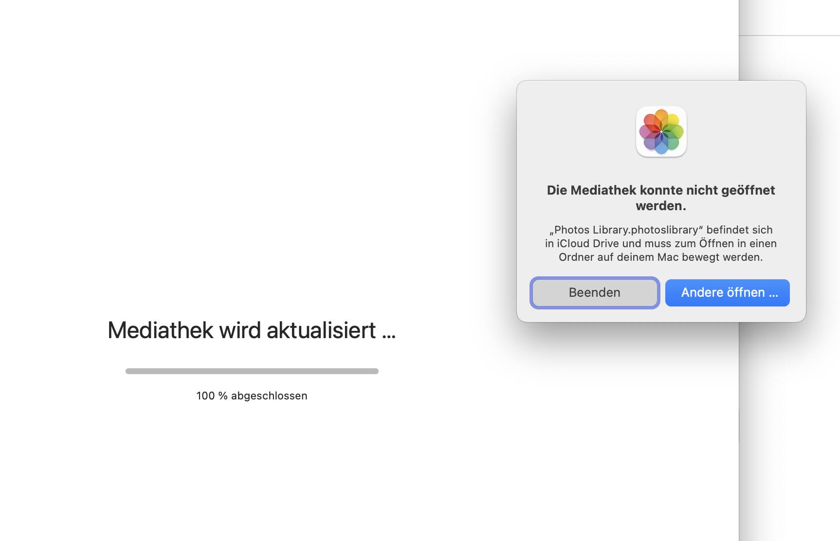 Das liegt daran, dass macOS Sonoma überprüft, ob die Fotos Mediathek an einem geeigneten Speicherort liegt. Sonoma lässt es nicht mehr zu, dass wir die Mediathek in iCloud Drive öffnen, da eine Fotosmediathek auf iCloud Drive durch die Synchronisation beschädigt werden könnte. Die früheren Versionen von macOS haben das leider zugelassen, obwohl es zu Datenverlust führen kann. Um Speicherplatz für Fotos mit iCloud zu sparen, ist die einzig sichere Art, iCloud Fotos zu verwenden und "Optimiere Mac Speicher" in den Fotos Einstellungen zu aktivieren.