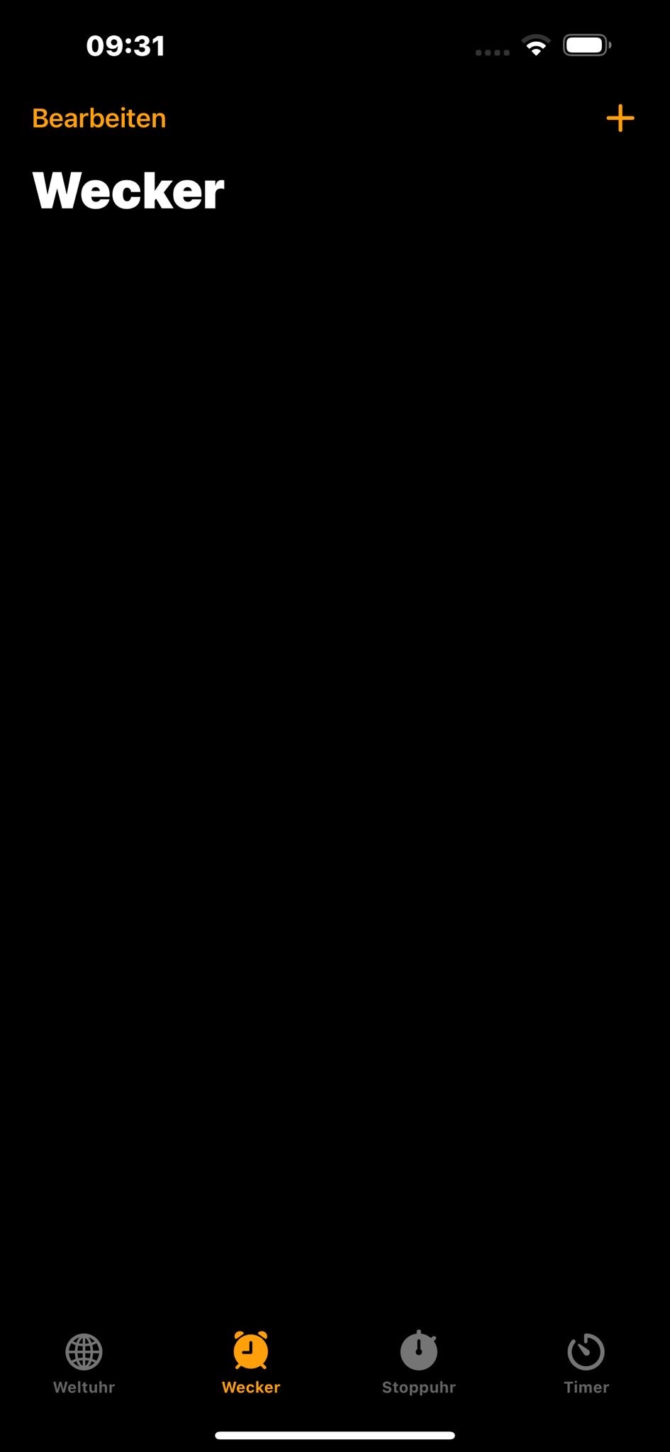 Ich stelle den Wecker so wie in der „Apple-Anleitung“ angegeben. Wenn ich auf speichern klicke gelange ich zu der Übersicht in der eigentlich meine Wecker angezeigt werden. Diese Liste ist allerdings komplett leer.